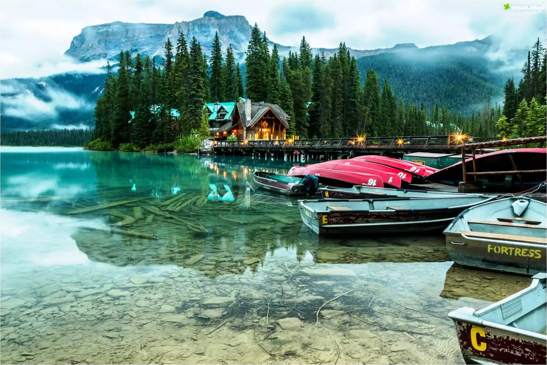 Zdjęcie Dom, Kajaki, Łódki, Góry, Las, Jezioro, Esmerald, Kanada