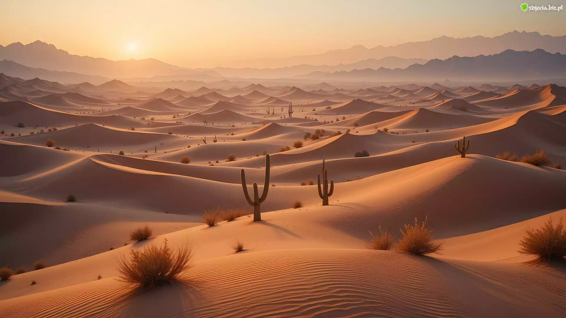 Zdjęcie Pustynia, Wydmy, Piaski, Kaktusy, Zachód słońca, Grafika