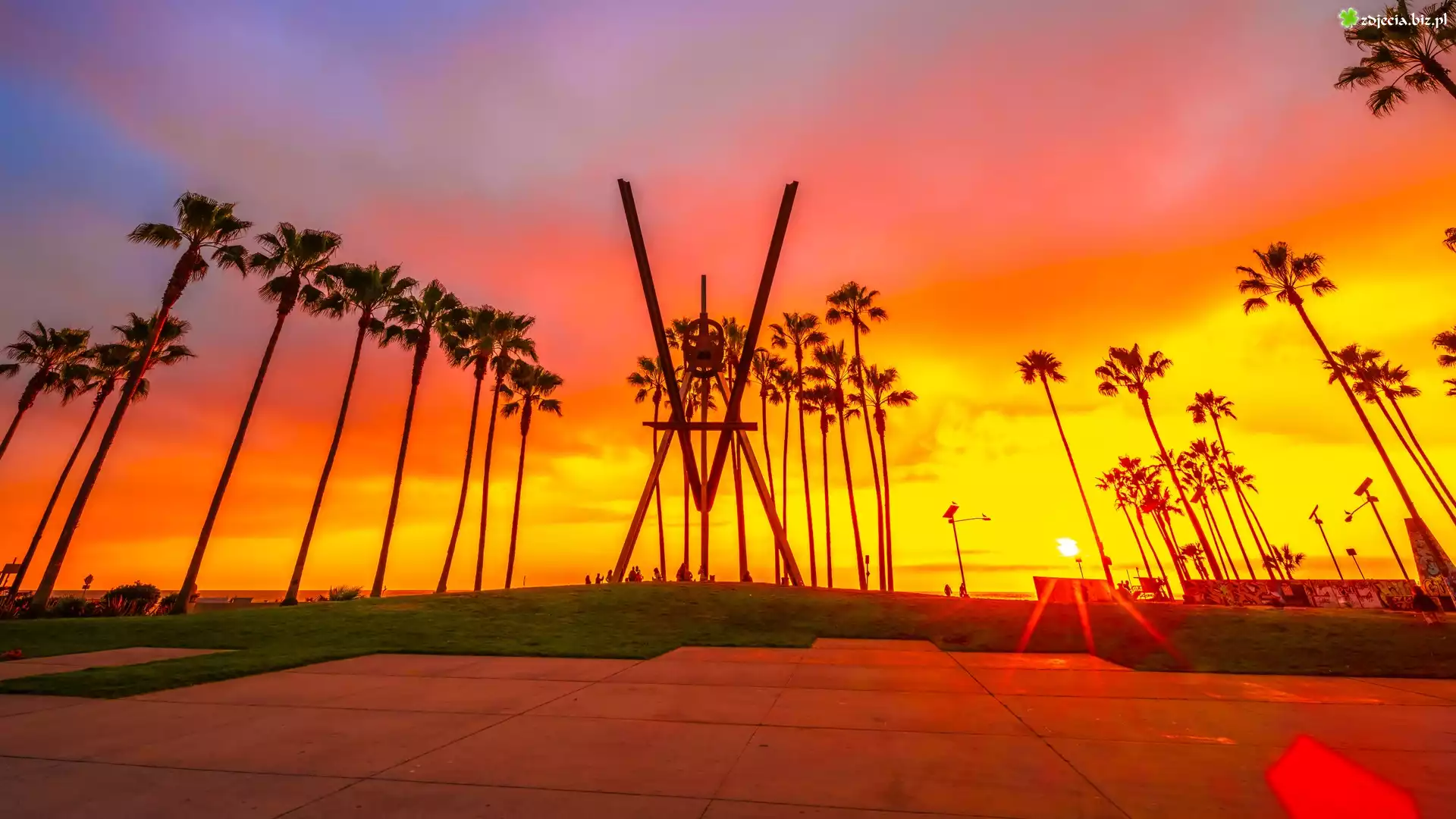 Zdjęcie Stany Zjednoczone, Kalifornia, Venice Beach V Sculpture, Morze, Palmy, Zachód słońca