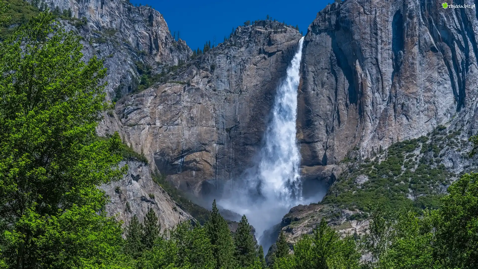 Zdjęcie Góry, Drzewa, Wodospad, Upper Yosemite Falls, Park Narodowy Yosemite, Kalifornia, Stany Zjednoczone |