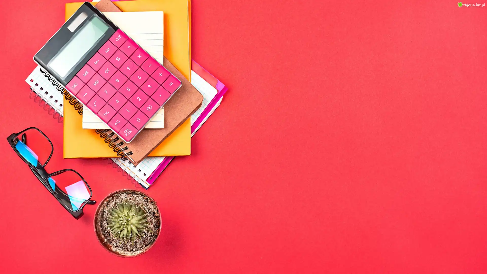 Zdjęcie Kalkulator, Okulary, Kaktus, Notatnik, Kompozycja