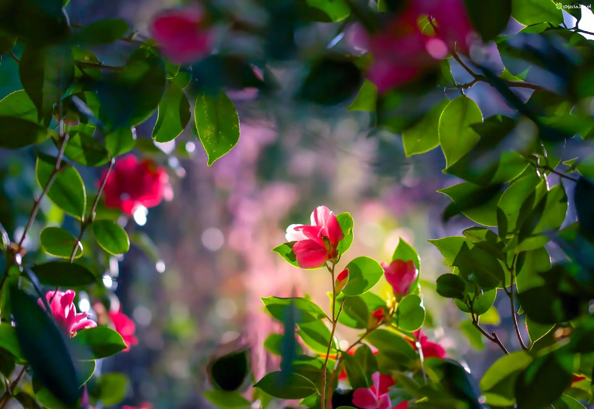 Zdjęcie Kamelia, Kwiaty, Światło, Liście, Bokeh