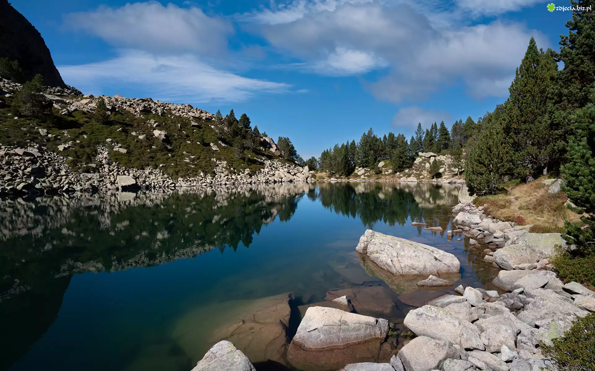 Zdjęcie Góry, Jezioro, Drzewa, Kamienie, Niebo, Chmury
