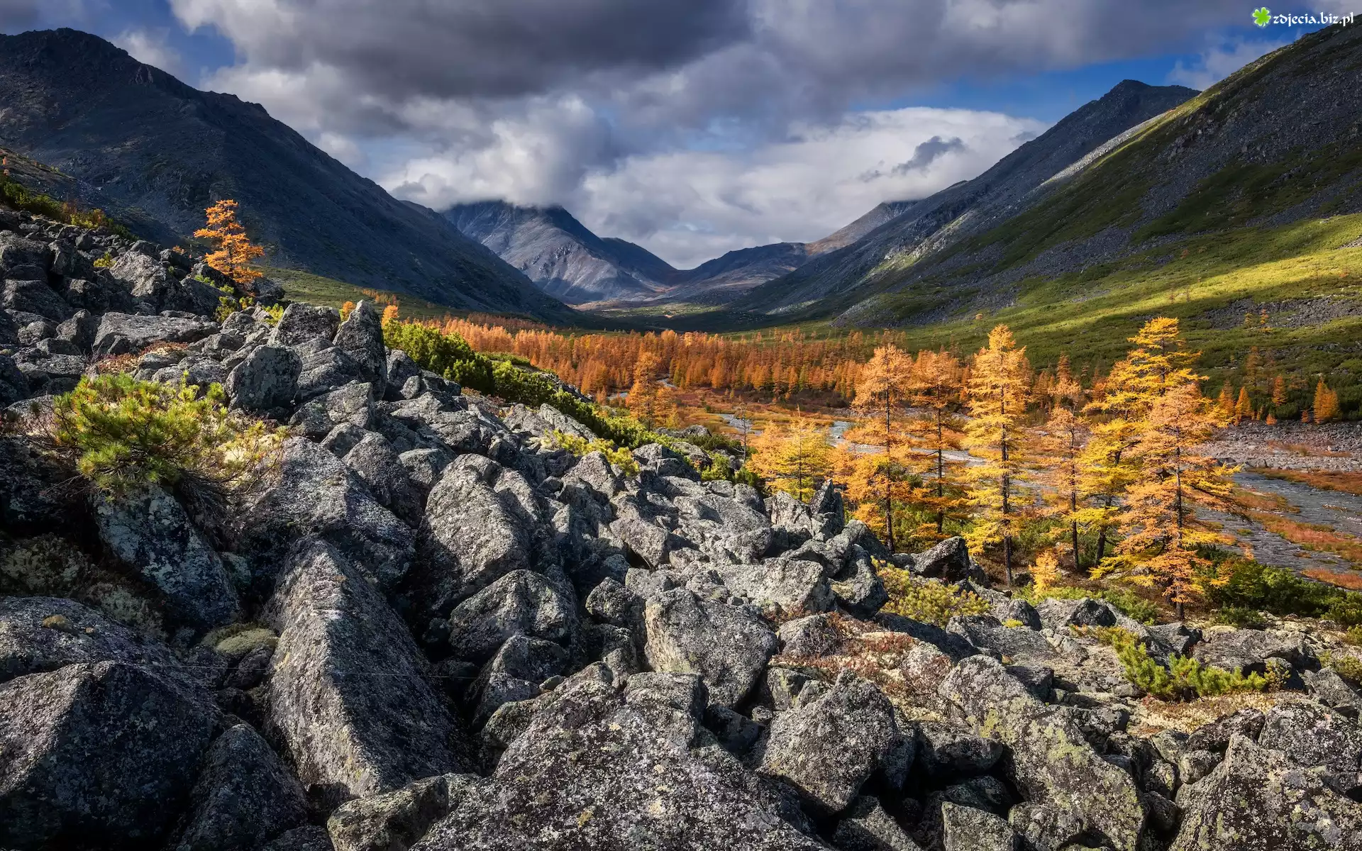 Zdjęcie Rosja, Kołyma, Góry, Kamienie, Jesień, Drzewa