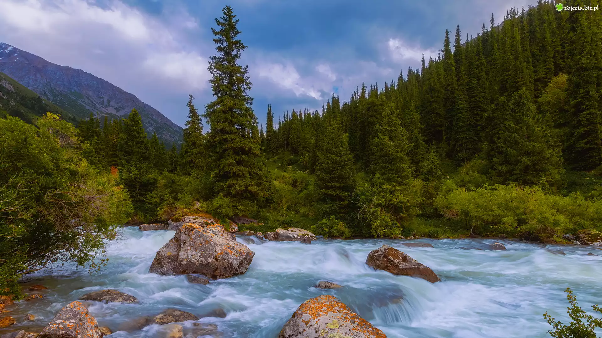 Zdjęcie Rzeka, Kamienie, Głazy, Drzewa, Góry