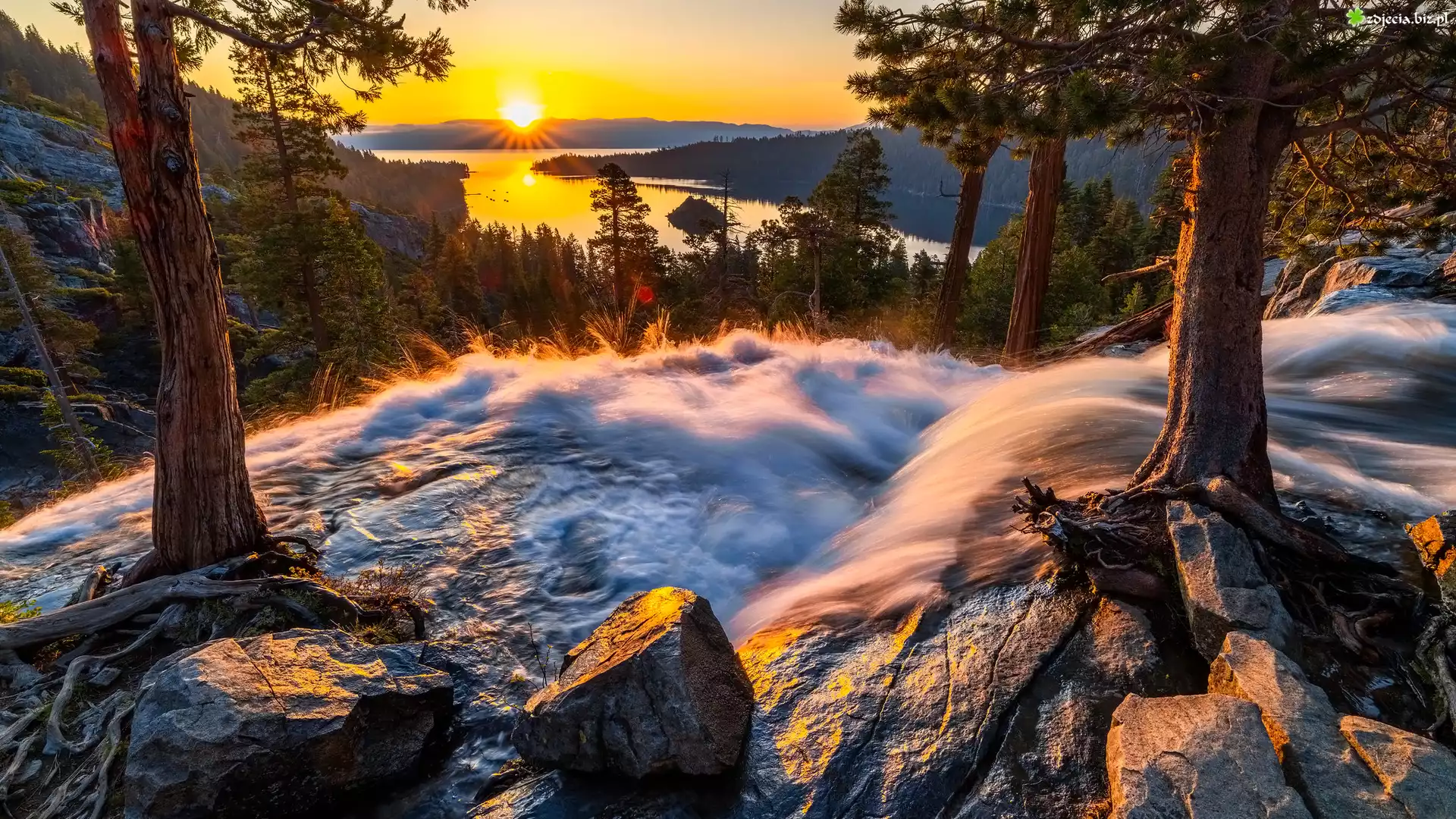 Zdjęcie Zachód słońca, Promienie słońca, Góry, Sierra Nevada, Drzewa, Kamienie, Jezioro, Tahoe Lake, Stany Zjednoczone |