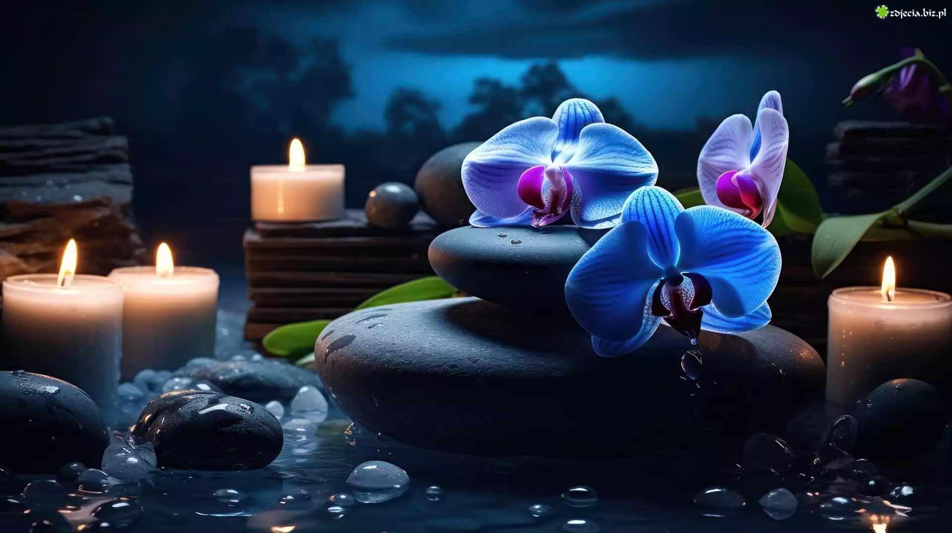 Zdjęcie Orchidea, Kwiaty, Storczyki, Kamienie, Świece, Grafika