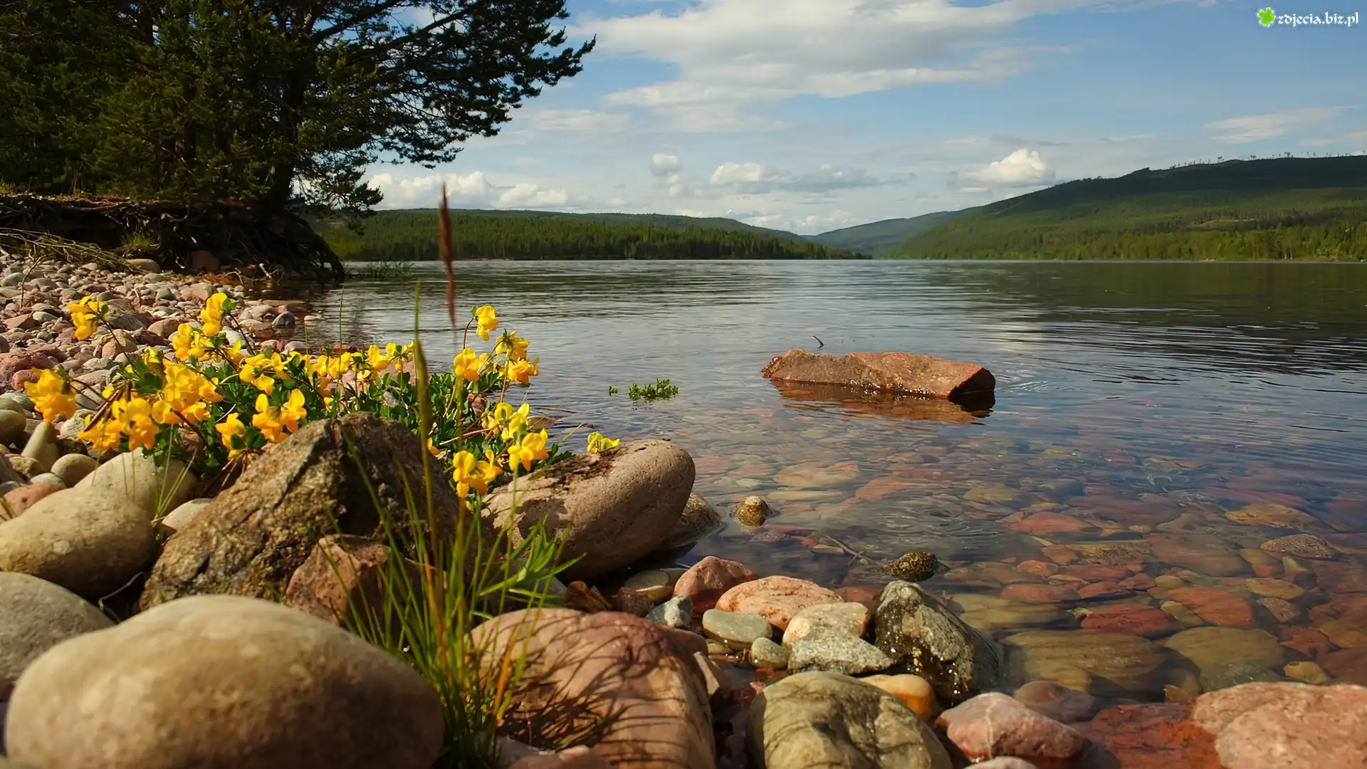 Zdjęcie Jezioro, Kamienie, Kwiaty
