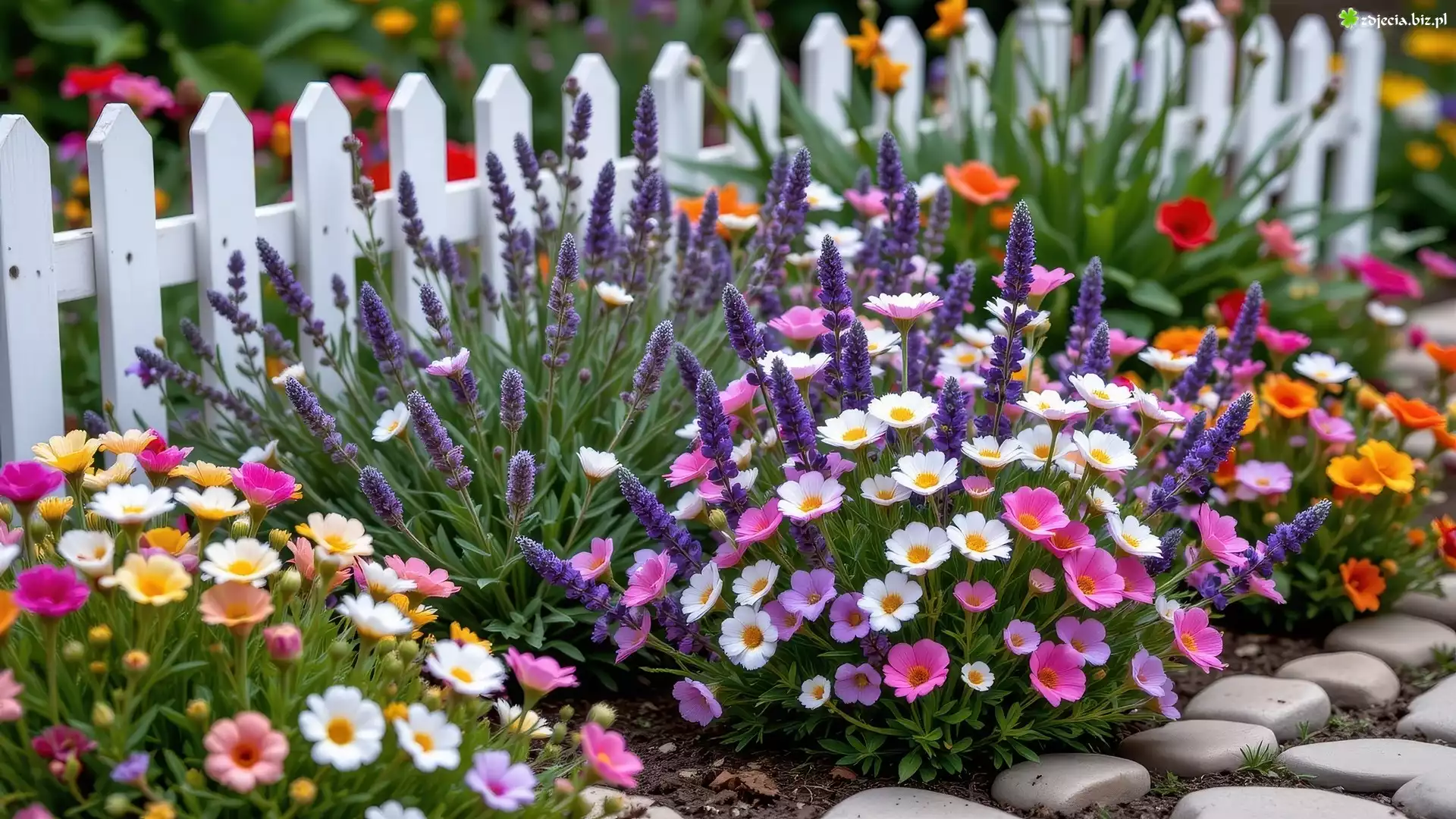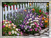 Zdjęcie Kolorowe, Kwiaty, Płot, Kamienie