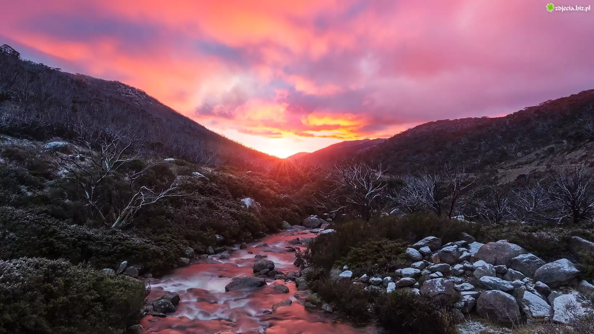 Zdjęcie Wschód słońca, Góry, Kamienie, Potok, Krzewy