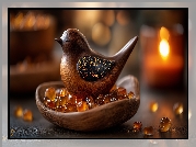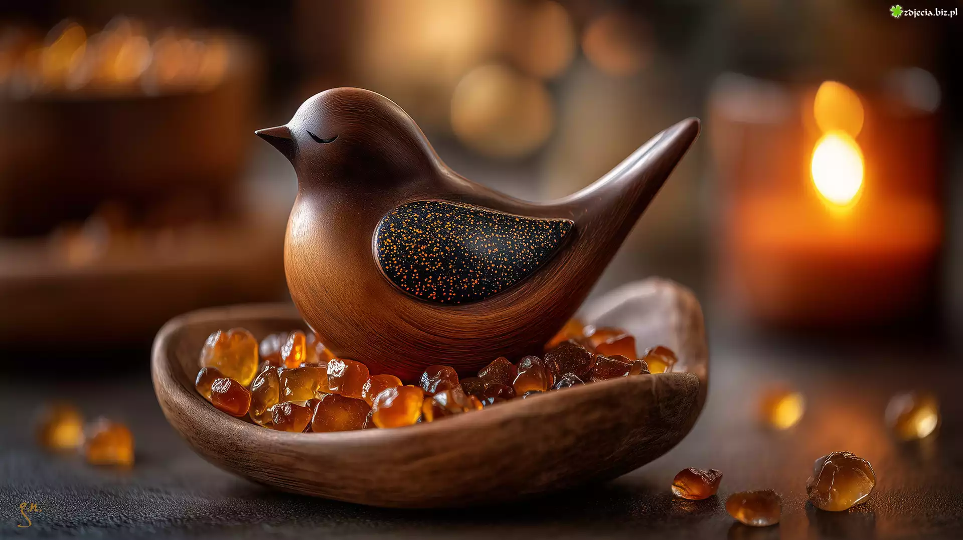 Zdjęcie, Drewniany, Ptak, Miska, Kamienie, Dekoracja, Grafika AI