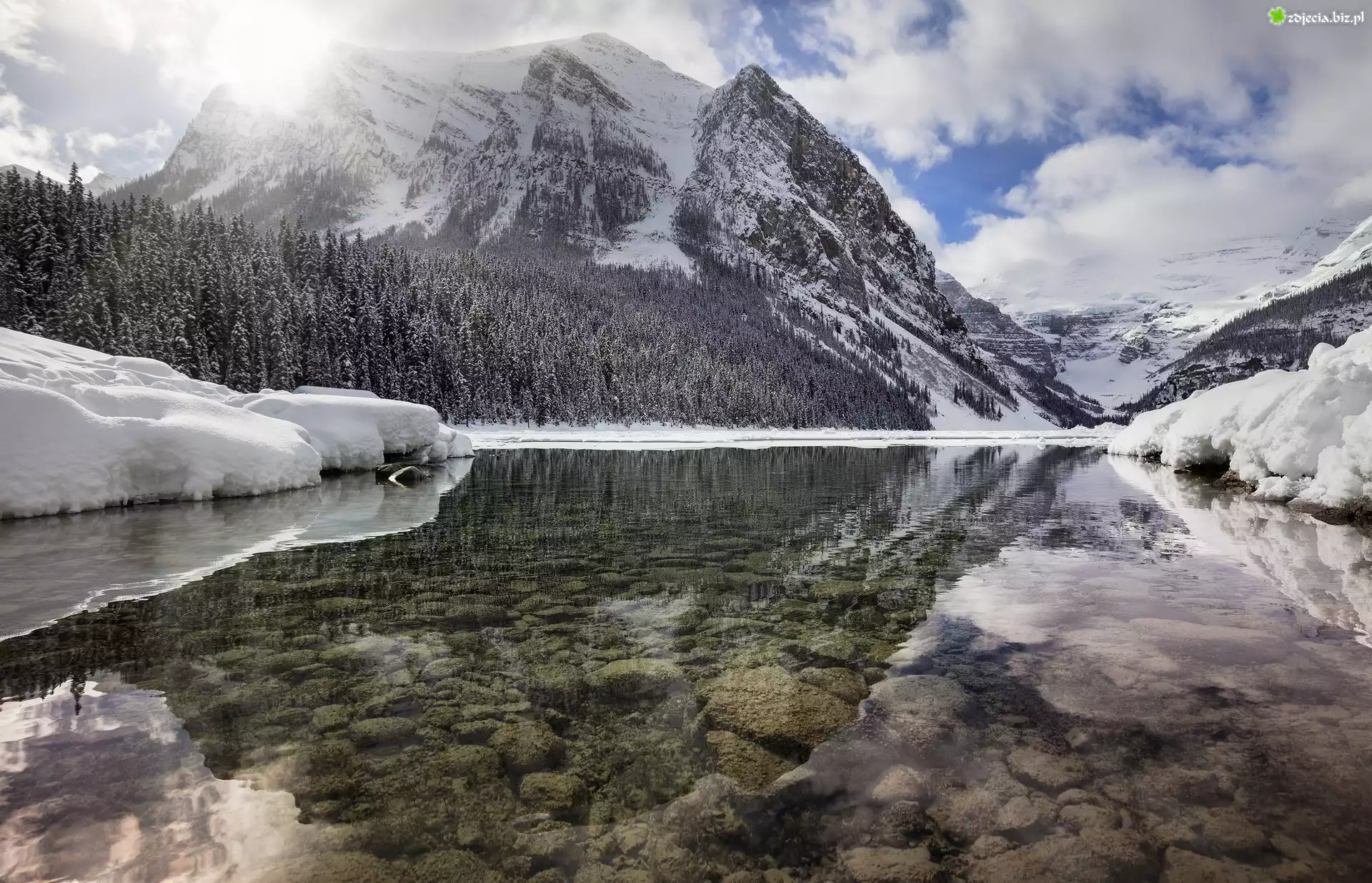 Zdjęcie Jezioro Lake Louise, Park Narodowy Banff, Kanada, Zima, Góry, Kamienie