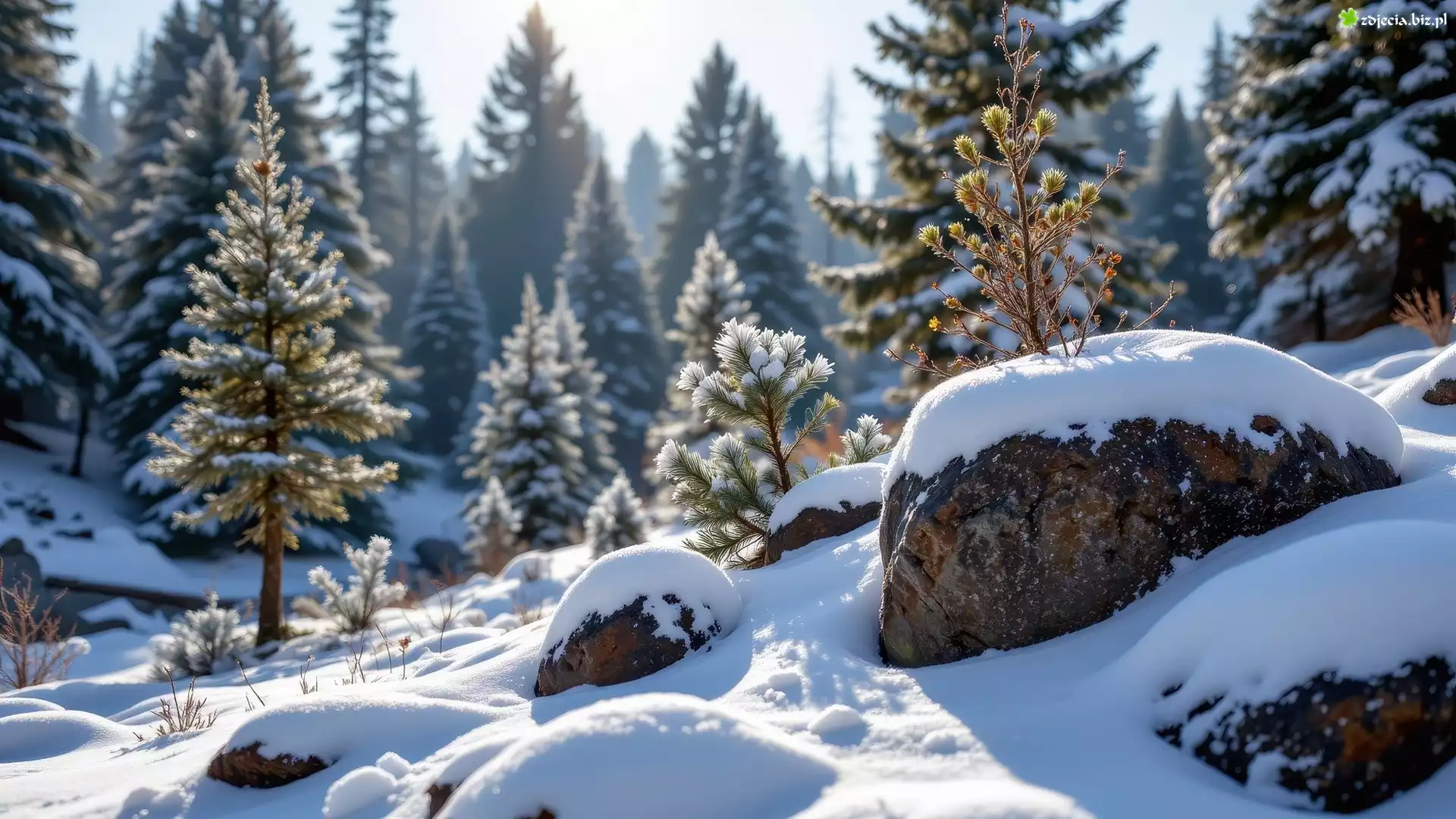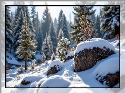 Zdjęcie Zima, Śnieg, Ośnieżone, Kamienie, Głazy, Drzewa, Iglaste