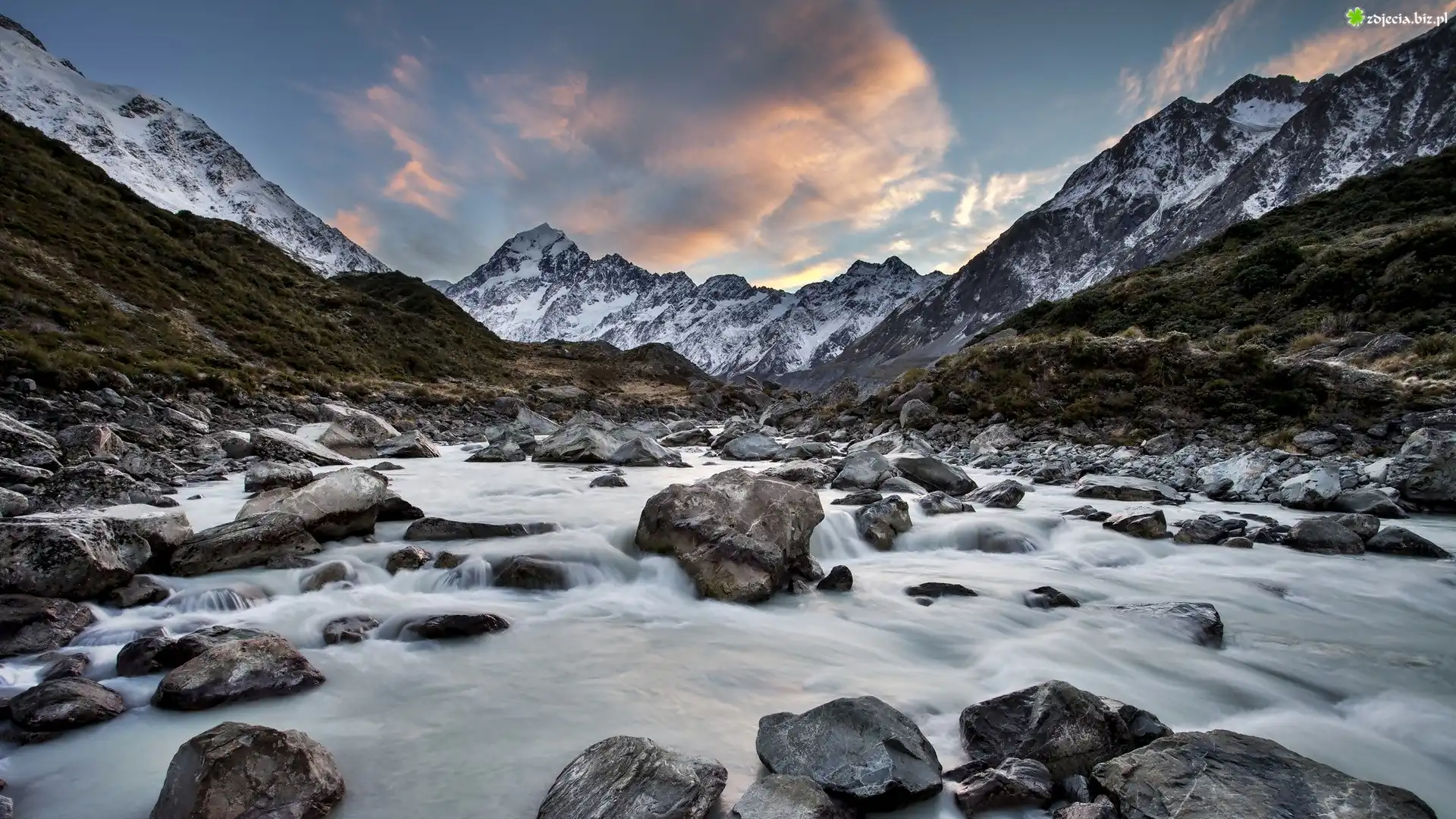 Zdjęcie Nowa Zelandia, Park Narodowy Góry Cooka, Góry, Rzeka, Kamienie