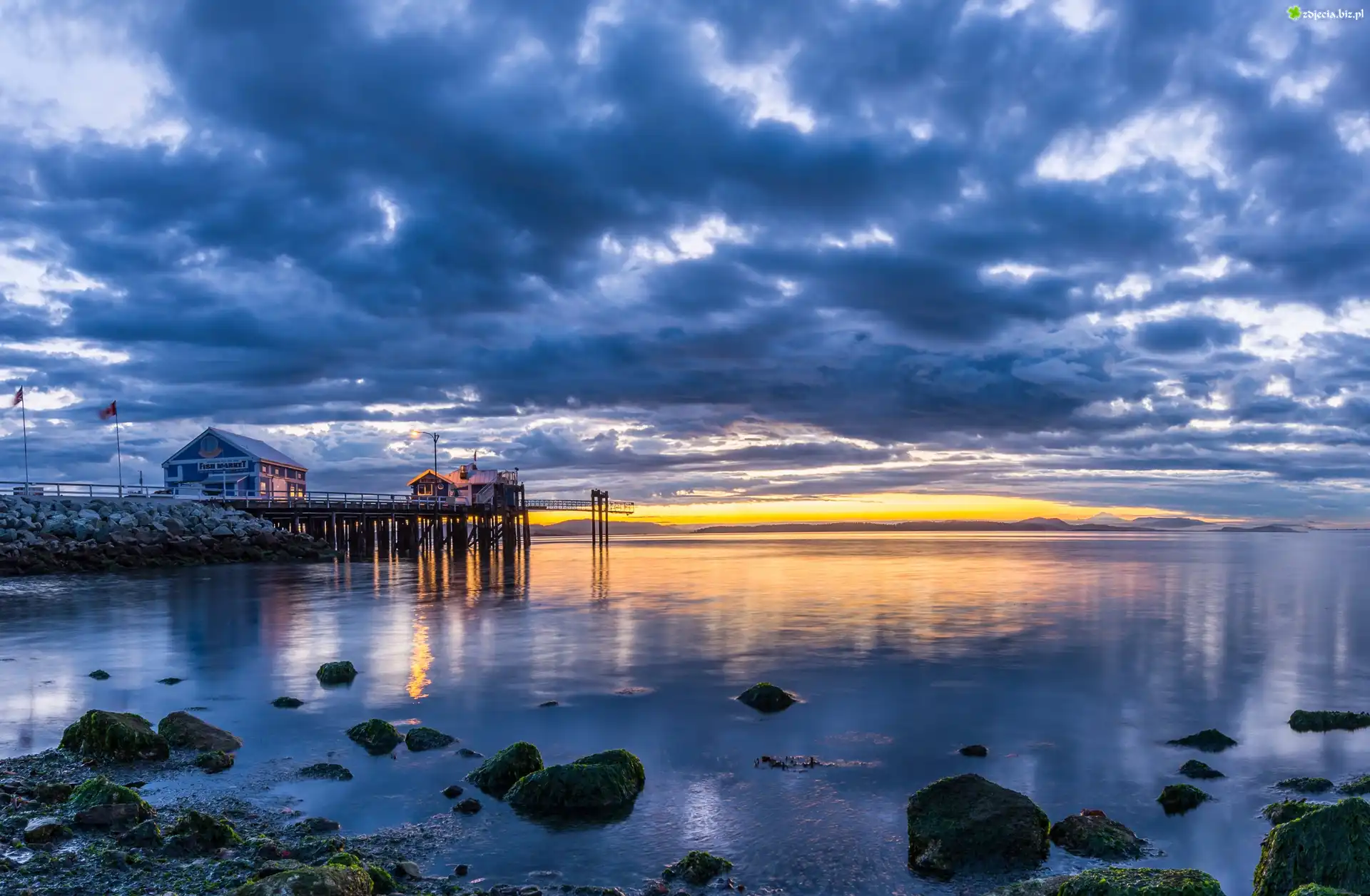 Zdjęcie, Kanada, Sidney, Morze, Molo, Restauracja, Sklep, Wschód słońca, Chmury, Kamienie
