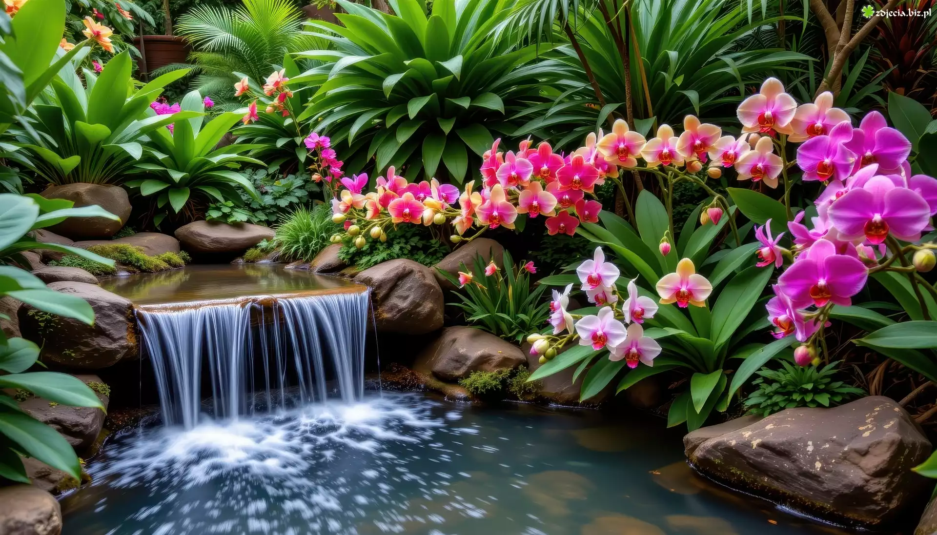 Zdjęcie Kamienie, Oczko wodne, Kwiaty, Kolorowe, Storczyki, Rośliny, Grafika AI