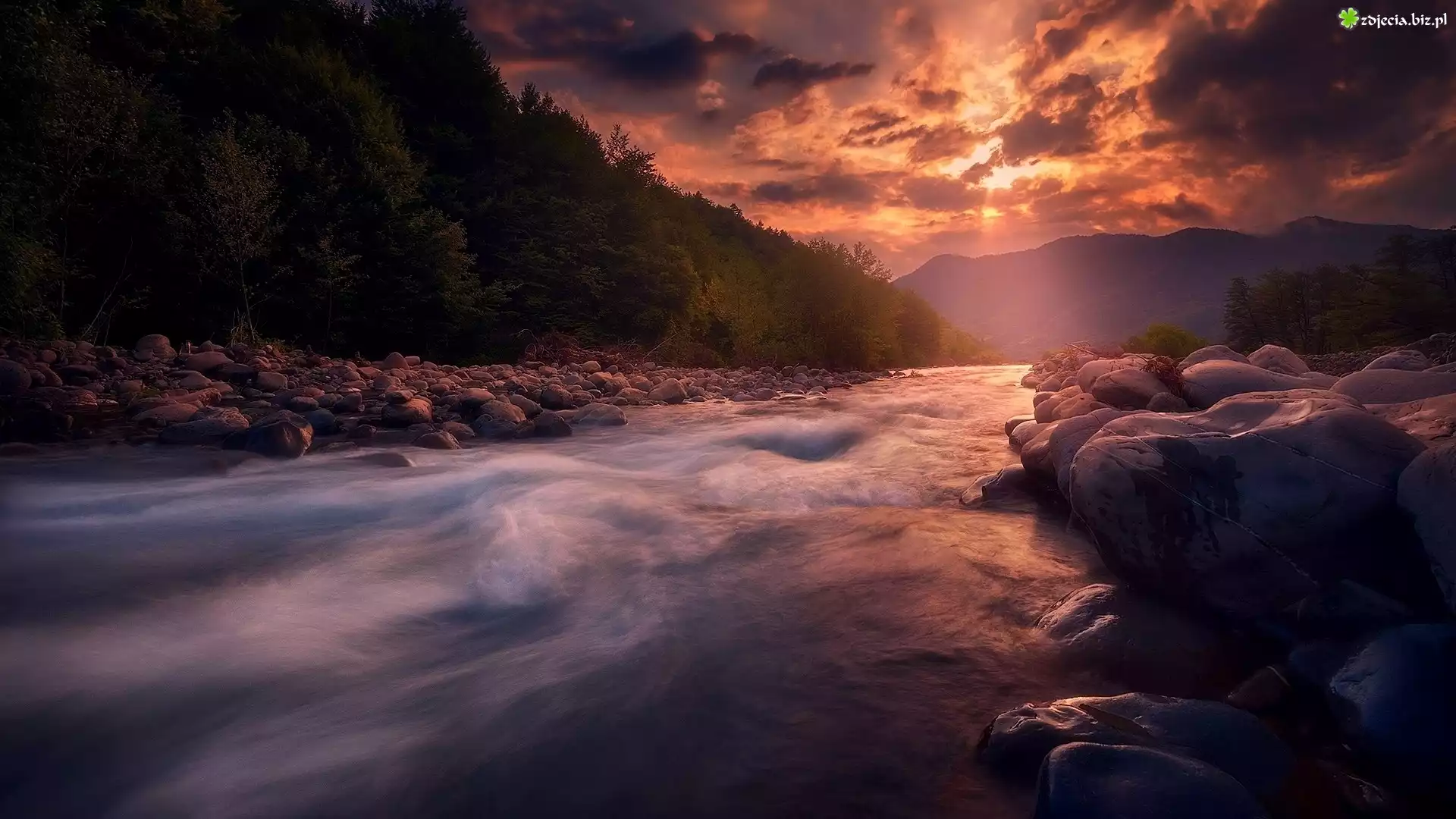 Zdjęcie Rzeka, Kamienie, Góry, Las, Chmury, Zachód słońca