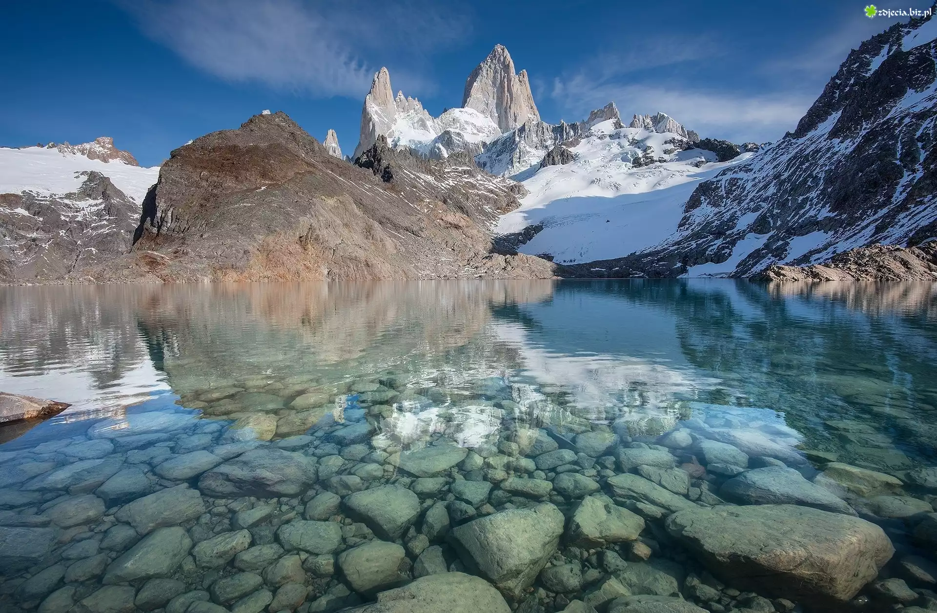 Zdjęcie Argentyna, Patagonia, Góry Andy, Szczyt Fitz Roy, Zima, Jezioro, Kamienie