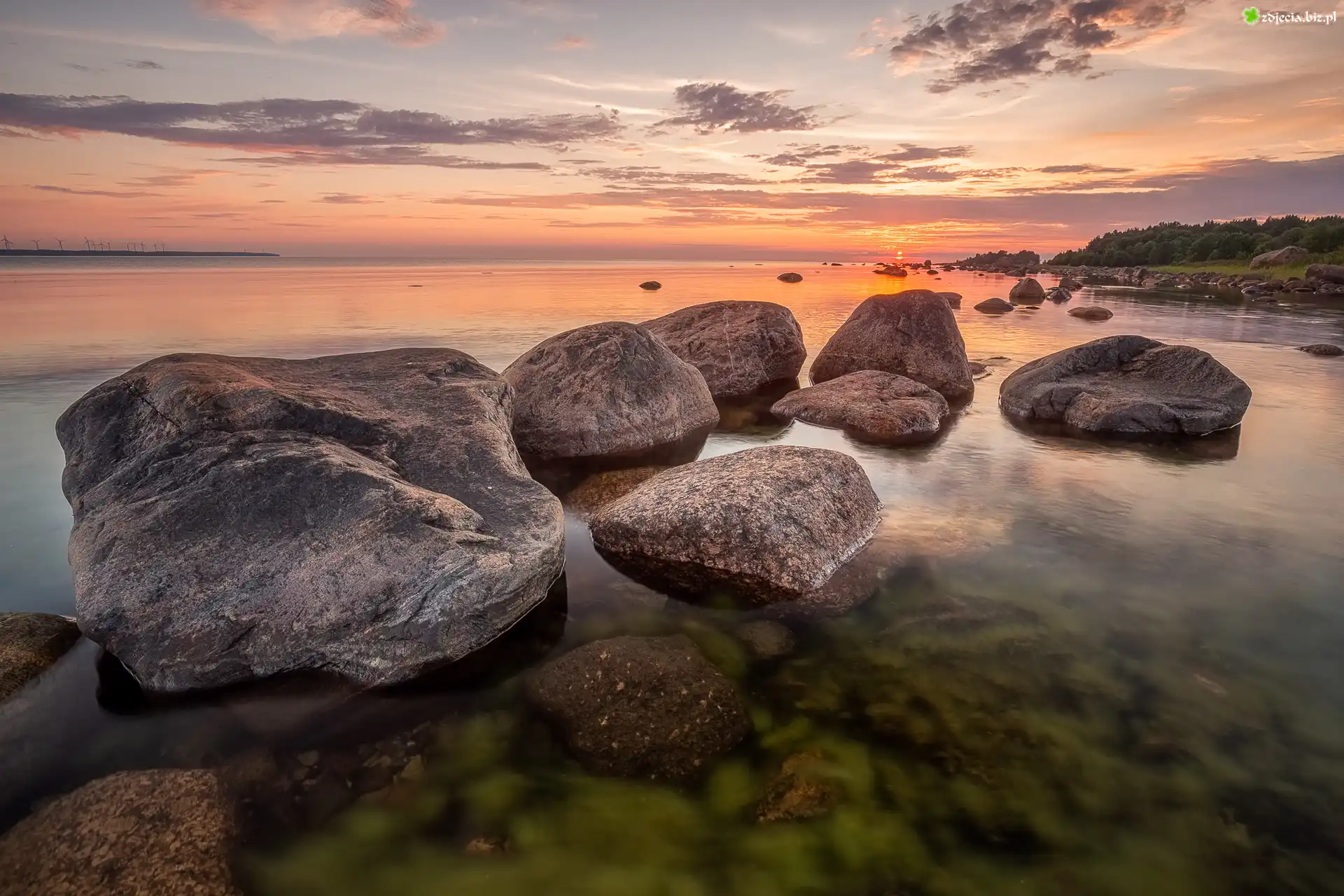 Zdjęcie Kamienie, Morze, Chmury, Niebo, Wschód słońca