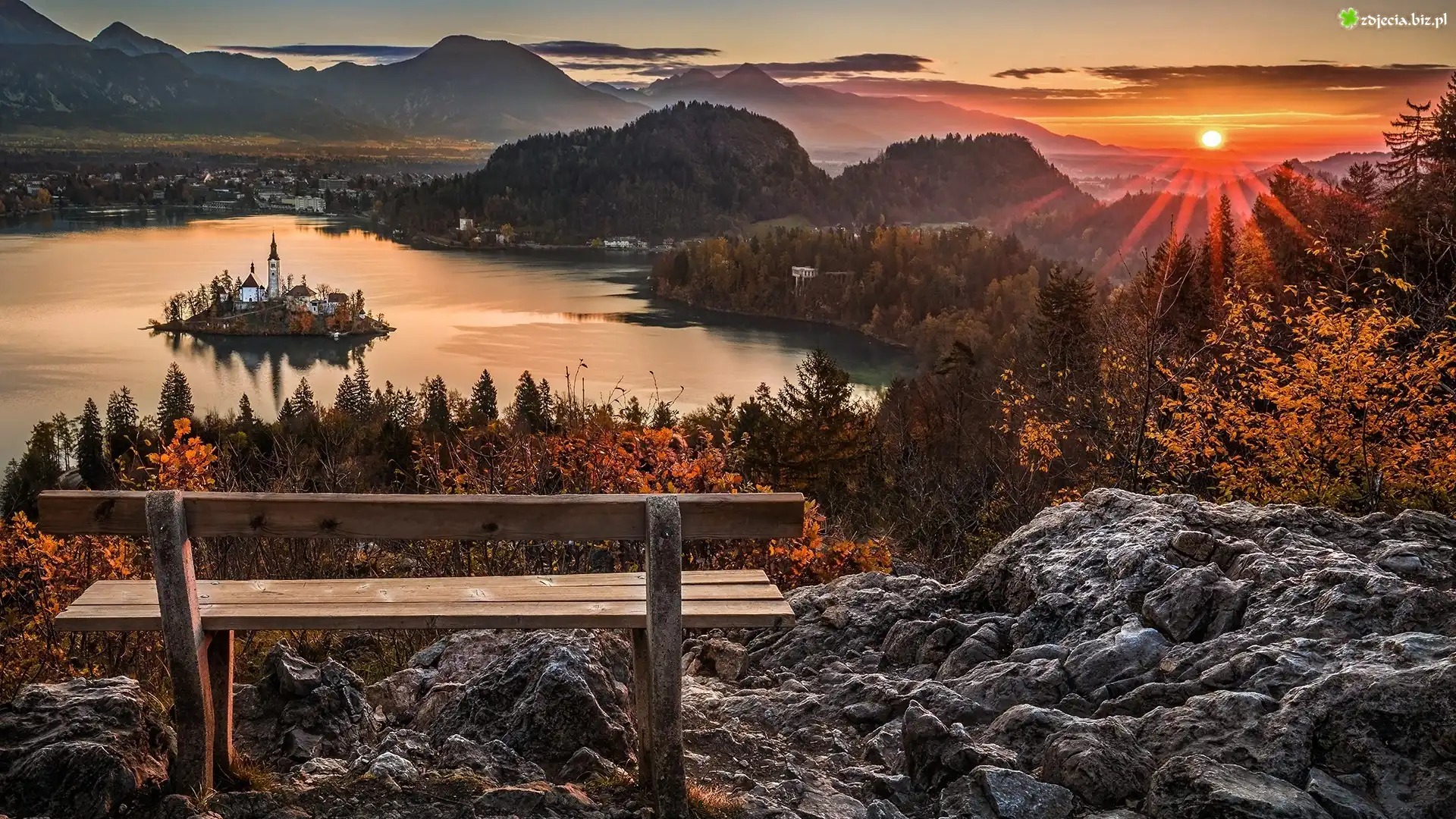 Zdjęcie Jesień, Drzewa, Jezioro Bled, Wyspa, Blejski Otok, Wzgórze, Kamienie, Ławka, Góry, Alpy Julijskie, Słowenia |