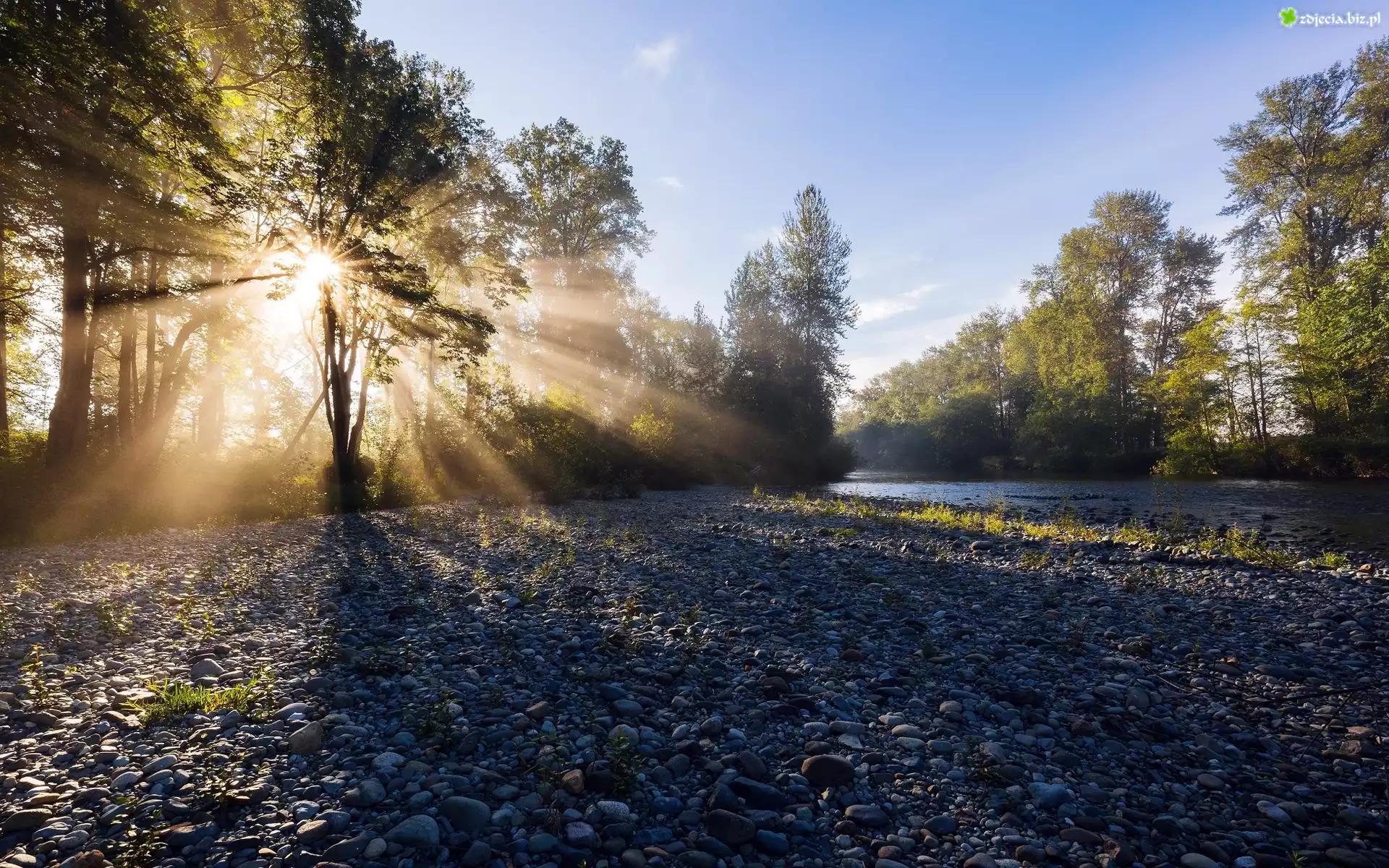 Zdjęcie Rzeka, Kamienisty, Brzeg, Świt, Promienie słońca, Drzewa