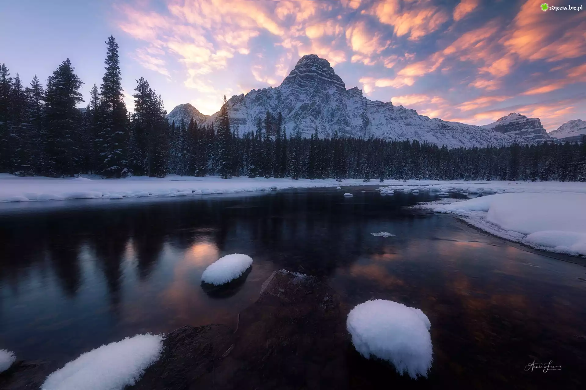 Zdjęcie Kanada, Park Narodowy Banff, Prowincja Alberta, Góry, Drzewa, Las, Rzeka, Bow River, Zima