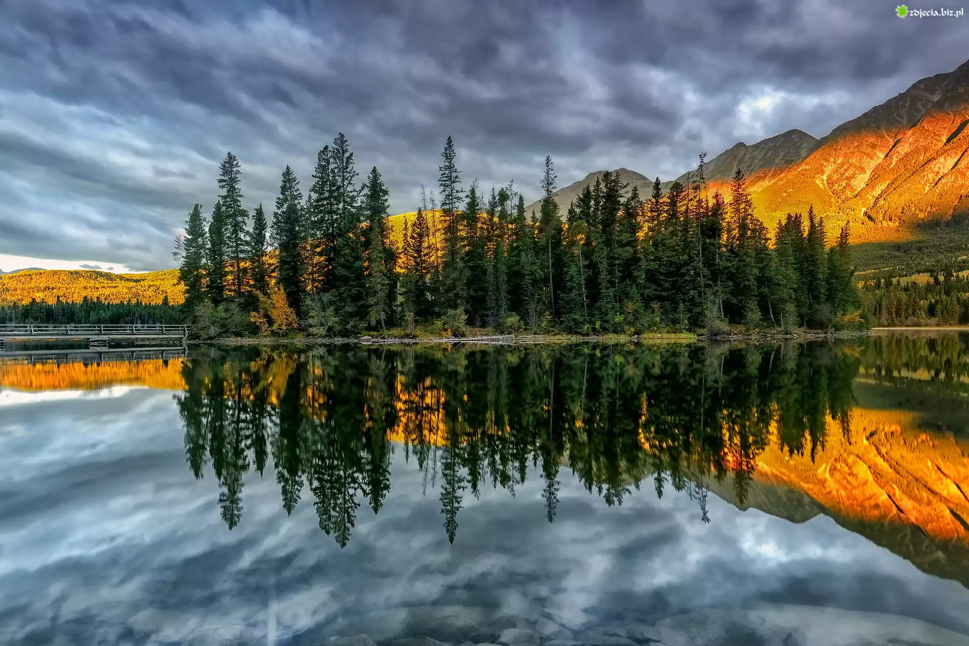 Zdjęcie Kanada, Park Narodowy Jasper, Góry, Jezioro Pyramid Lake, Chmury, Drzewa