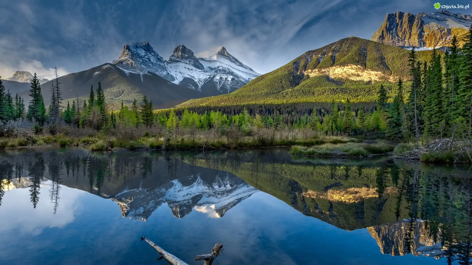 Zdjęcie Kanada, Prowincja Alberta, Canmore, Góry, Canadian Rockies, Góra Three Sisters, Rzeka, Bow River, Drzewa, Chmury |