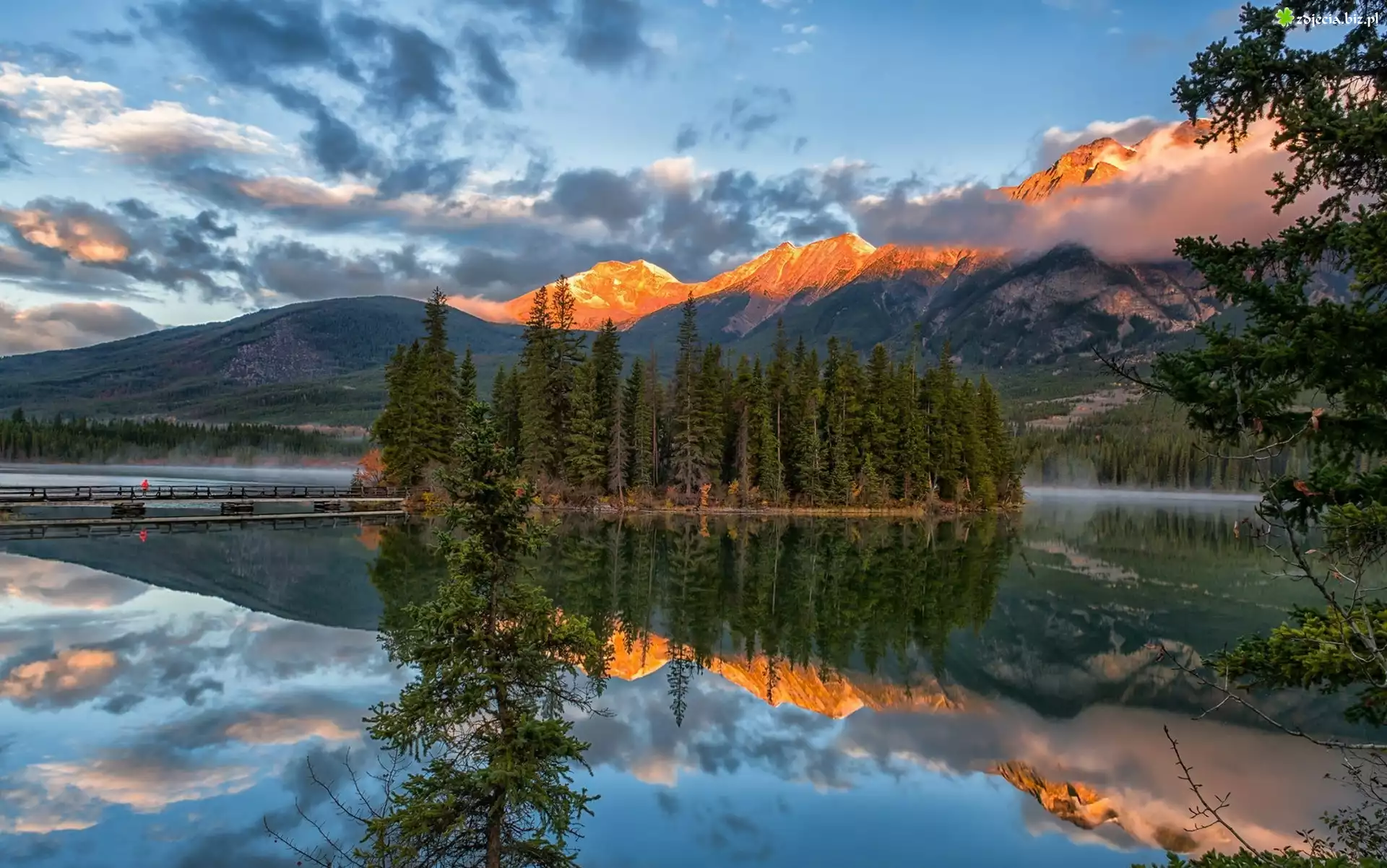Zdjęcie Kanada, Park Narodowy Jasper, Wyspa Pyramid Island, Góry, Jezioro Pyramid Lake, Chmury, Most, Drzewa, Odbicie |