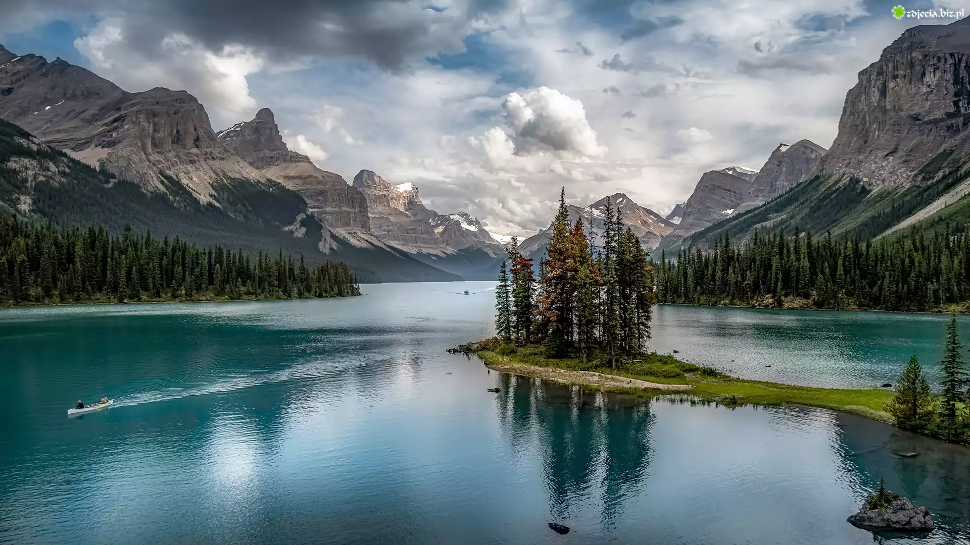 Zdjęcie Kanada, Alberta, Park Narodowy Jasper, Jezioro, Maligne Lake, Wyspa Ducha, Góry, Chmury, Drzewa |