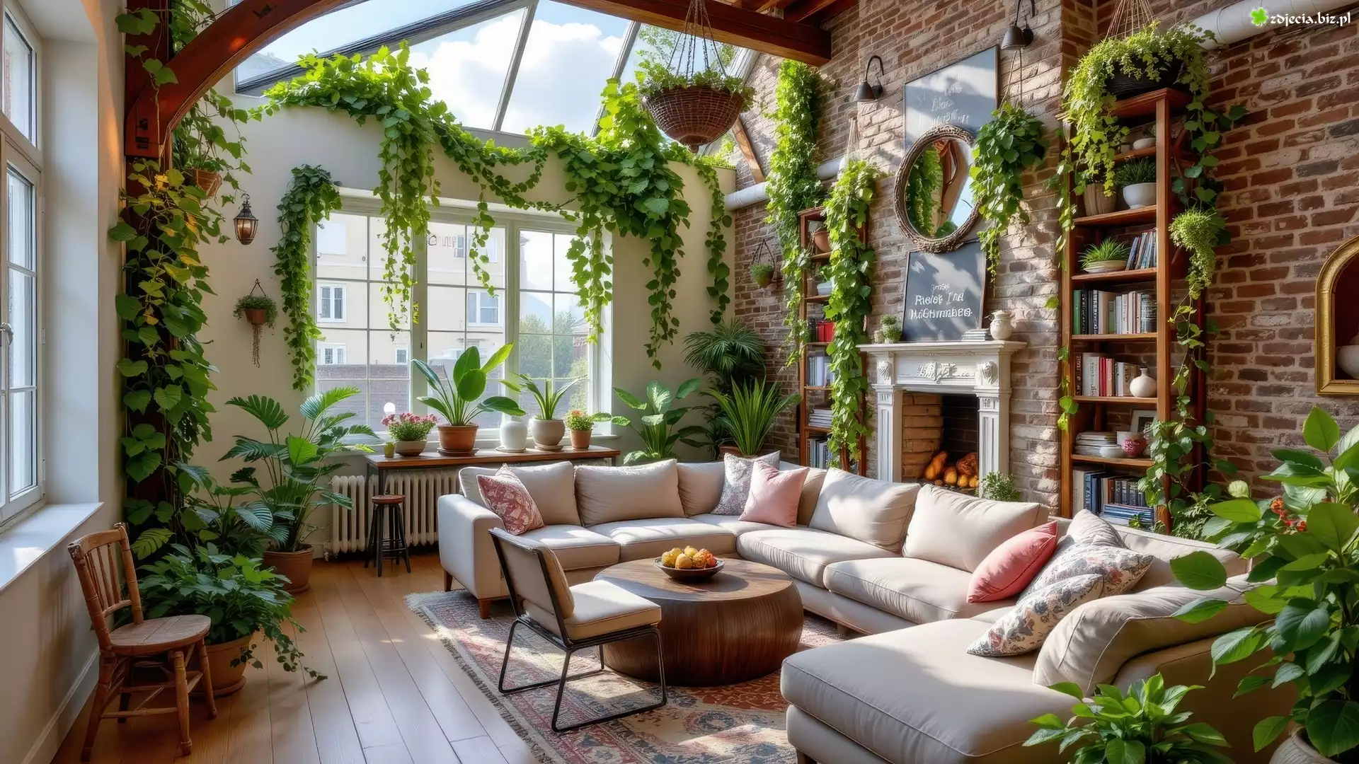Zdjęcie Salon, Kanapa, Krzesła, Kominek, Kwiaty