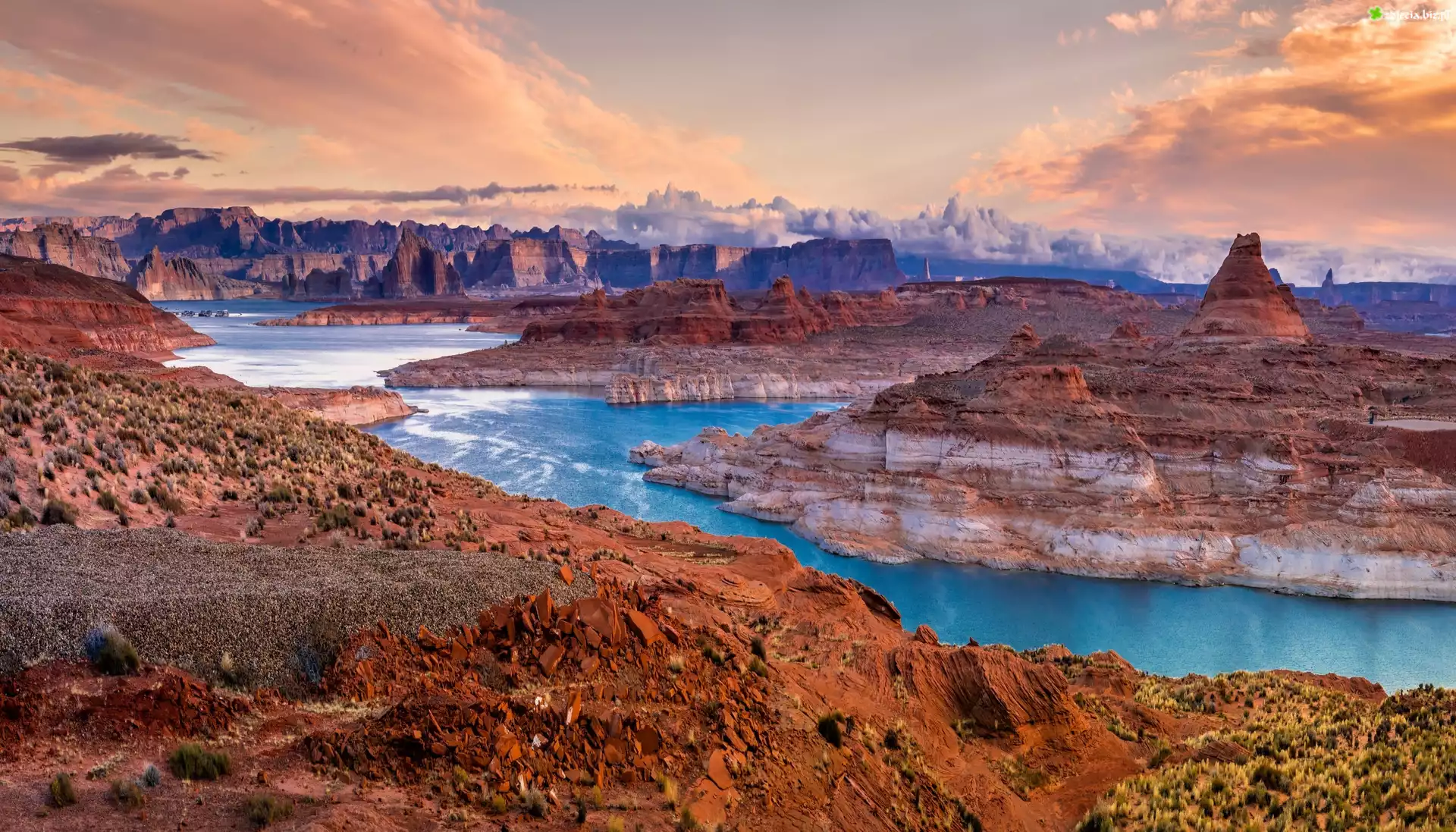 Kanion, Chmury, Rozlewiska, Utah Góra, Jeziora, Wisona Kanion, Zachód, Słońca Kaniony, Chmury, Niebo Góra, Jeziora Góra, Jezioro Jezioro, Księżyc, Łódka Zbocze, Góry, Jezioro Kanion, Skała Góry, Jezioro Kanion, Skały, Rzeka Zachód, Słońca, Woda, Ławka Chmury, Przebijające, Słońce, Jezioro Tafla, Wody, Falowanie