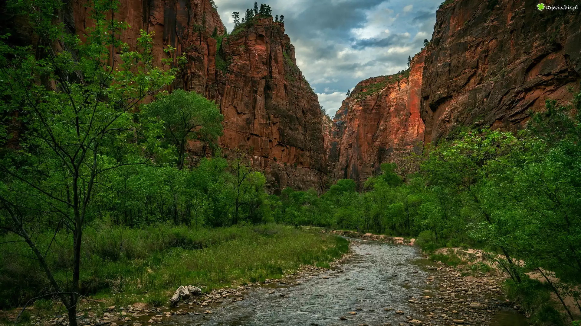 Zdjęcie Kanion Zion Narrows, Rzeka, Virgin River, Drzewa, Kamienie, Park Narodowy Zion, Stan Utah, Stany Zjednoczone |
