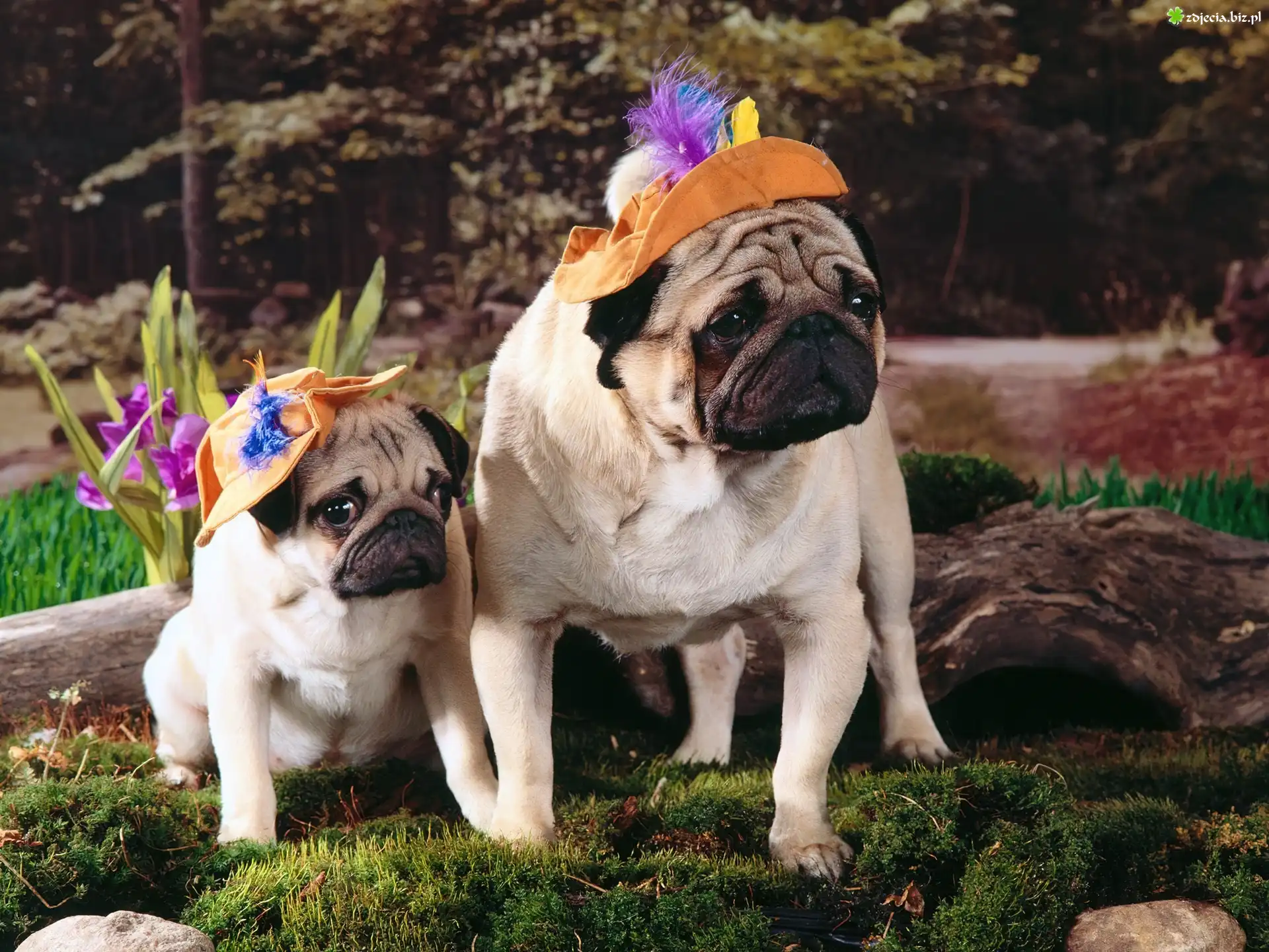 Zdjęcie, Mopsy, Kapelusiki, Trawka