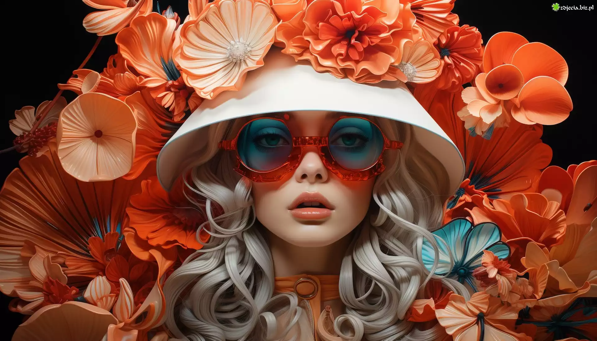Zdjęcie Kobieta, Twarz, Okulary, Kapelusz, Kwiaty, Grafika