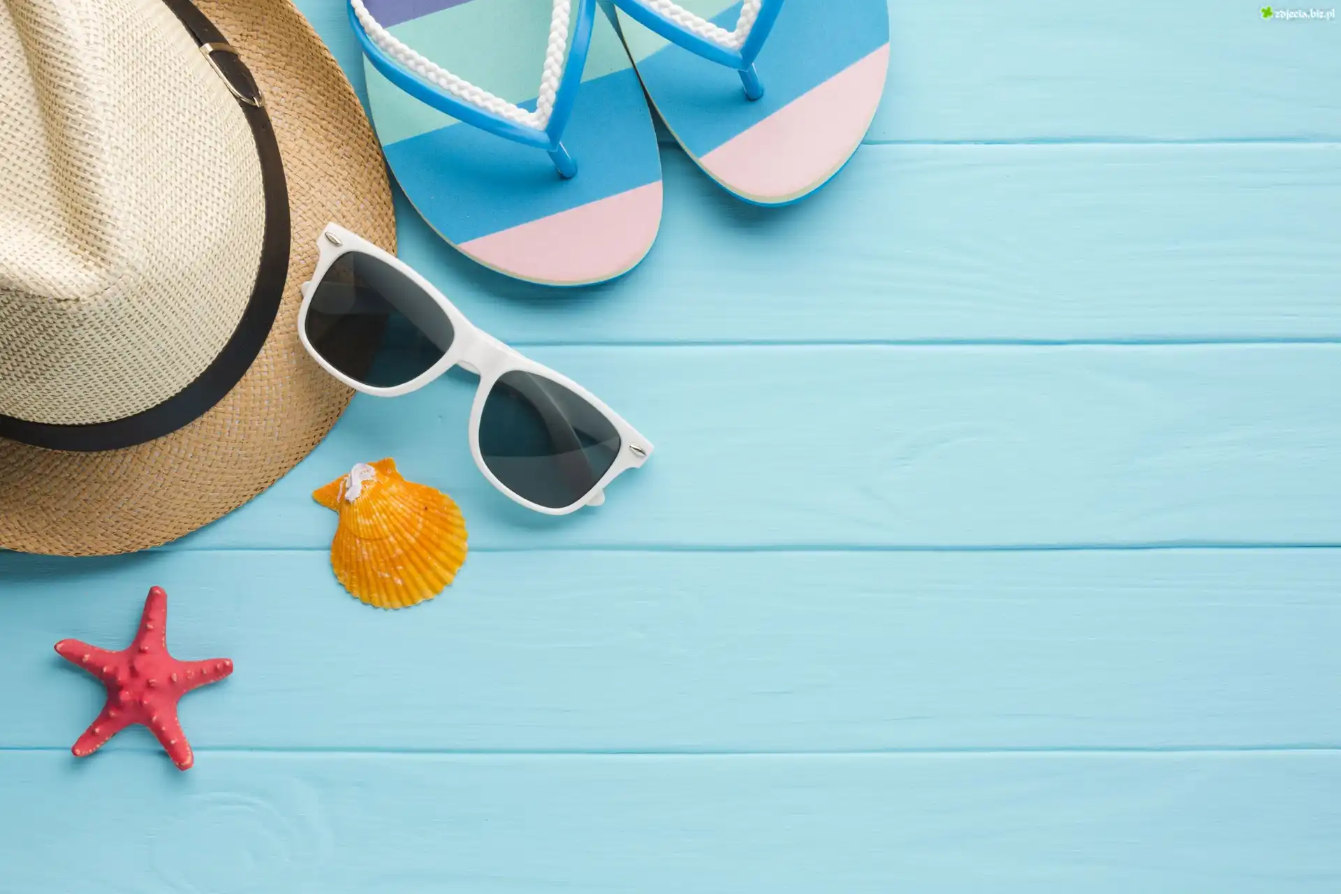 Zdjęcie, Kapelusz, Muszelka, Rozgwiazda, Okulary, Klapki, Kompozycja