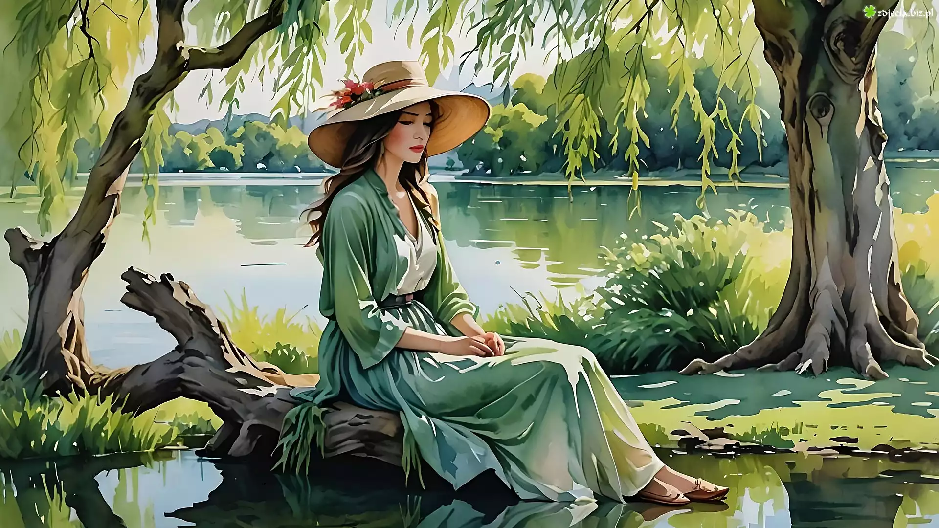 Zdjęcie Malarstwo, Jezioro, Kobieta, Kapelusz, Drzewa, Wierzby, Trawa