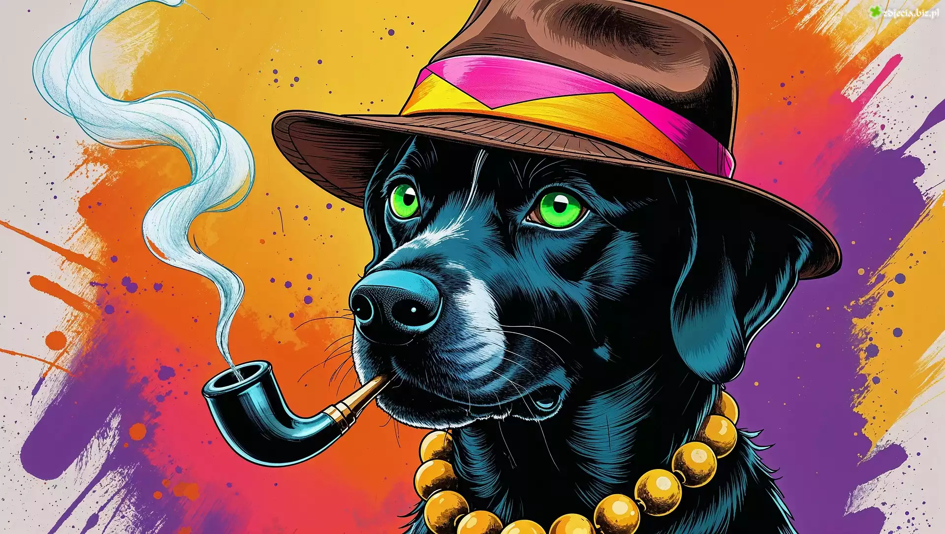 Zdjęcie Pies, Kapelusz, Korale, Fajka, Grafika