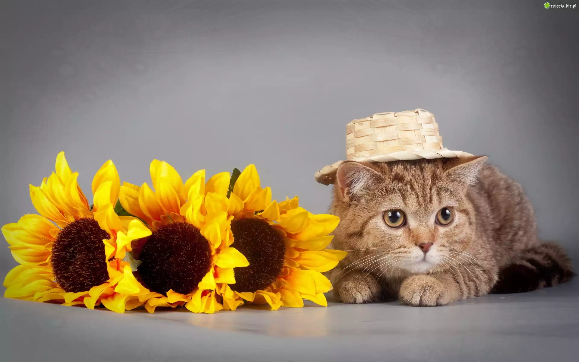Zdjęcie Kotek, Kapelusz, Słoneczniki