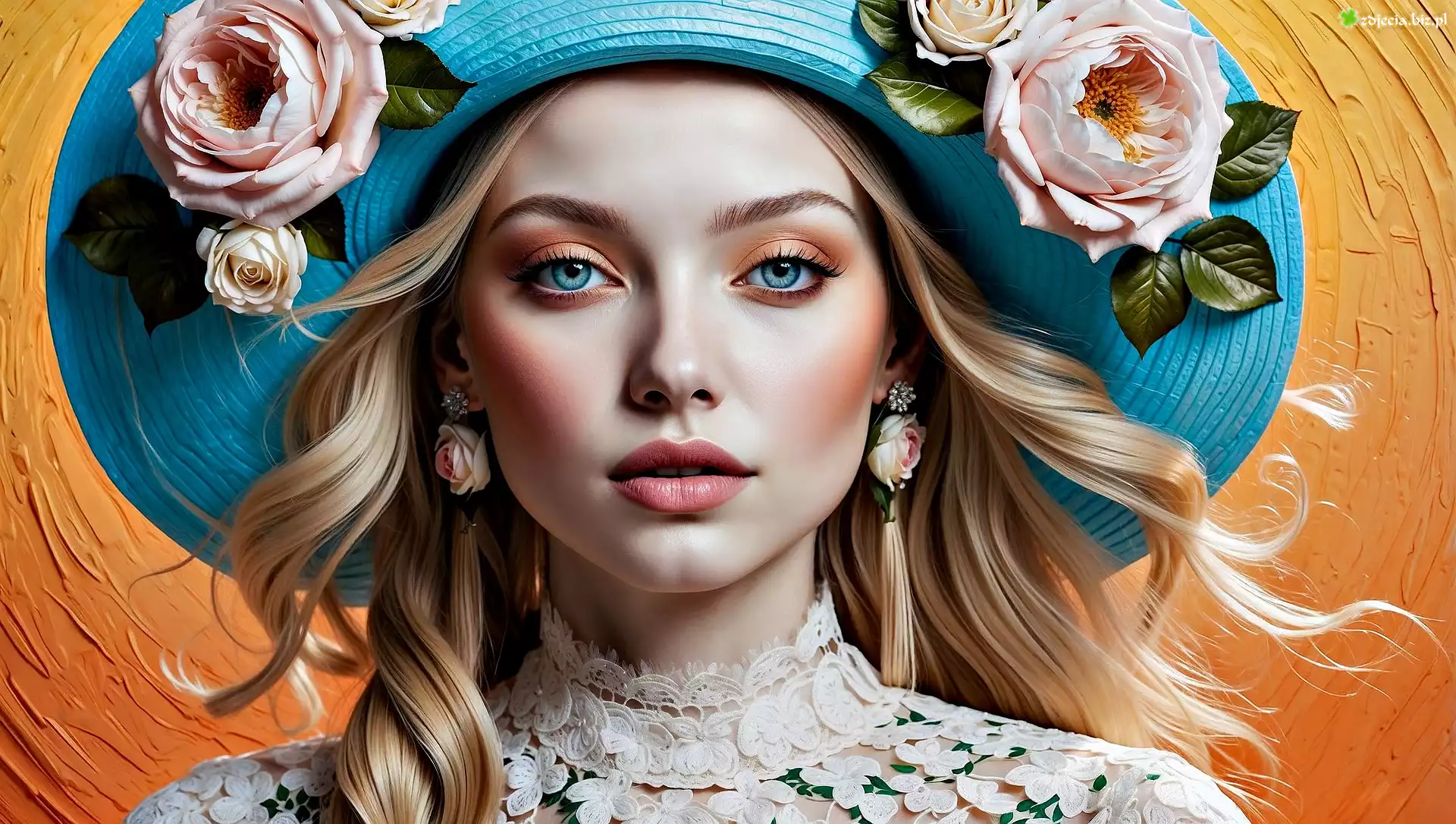 Zdjęcie, Kobieta, Kapelusz, Niebieski, Kwiaty, Róże