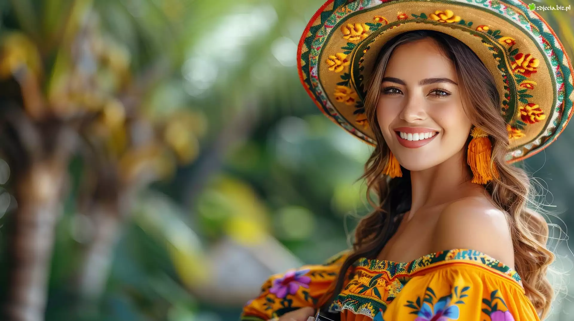Zdjęcie Uśmiechnięta, Długowłosa, Kobieta, Kapelusz, Kolczyki, Sukienka