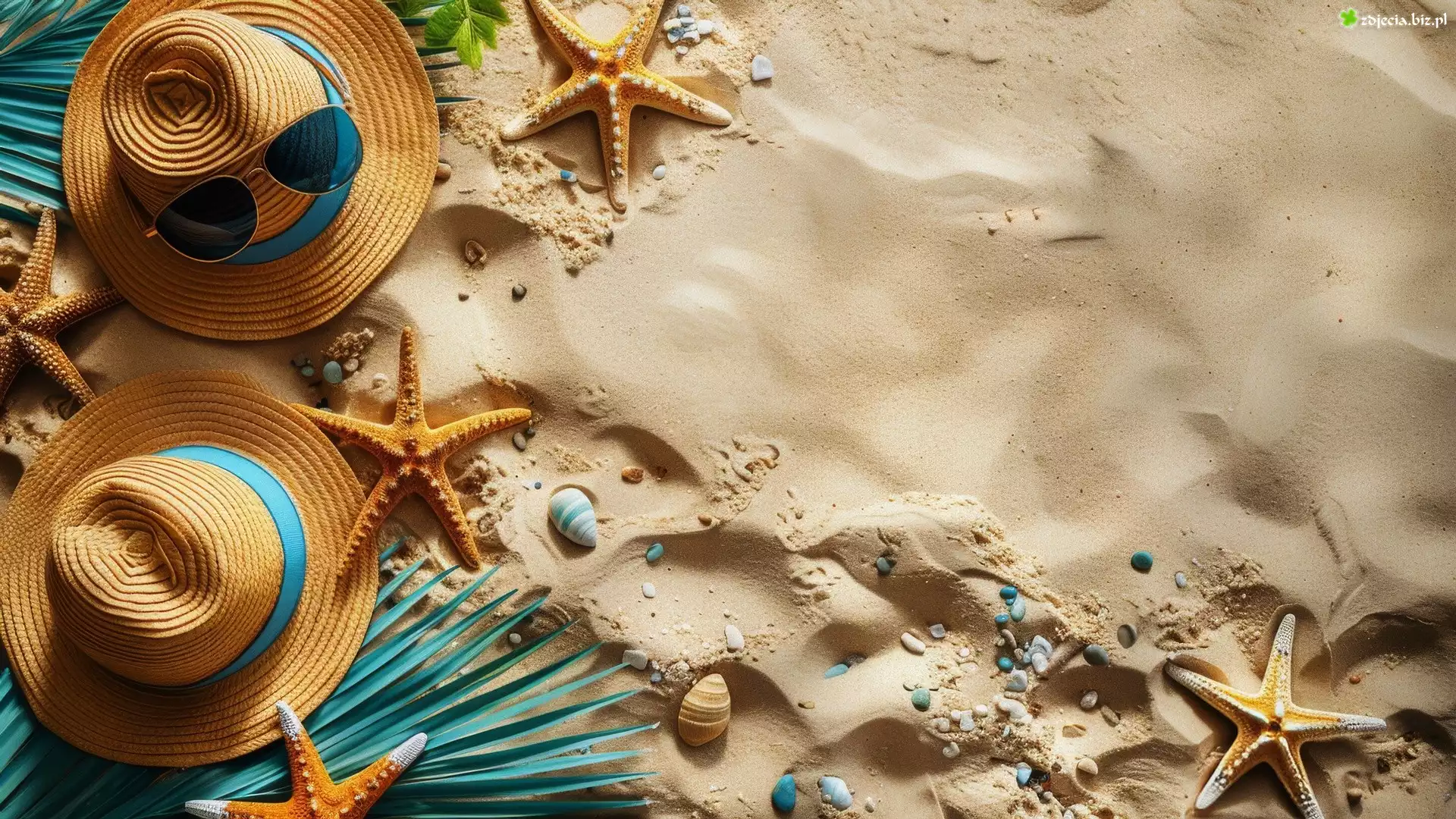 Zdjęcie, Plaża, Piasek, Dwa, Kapelusze, Rozgwiazdy, Muszelki