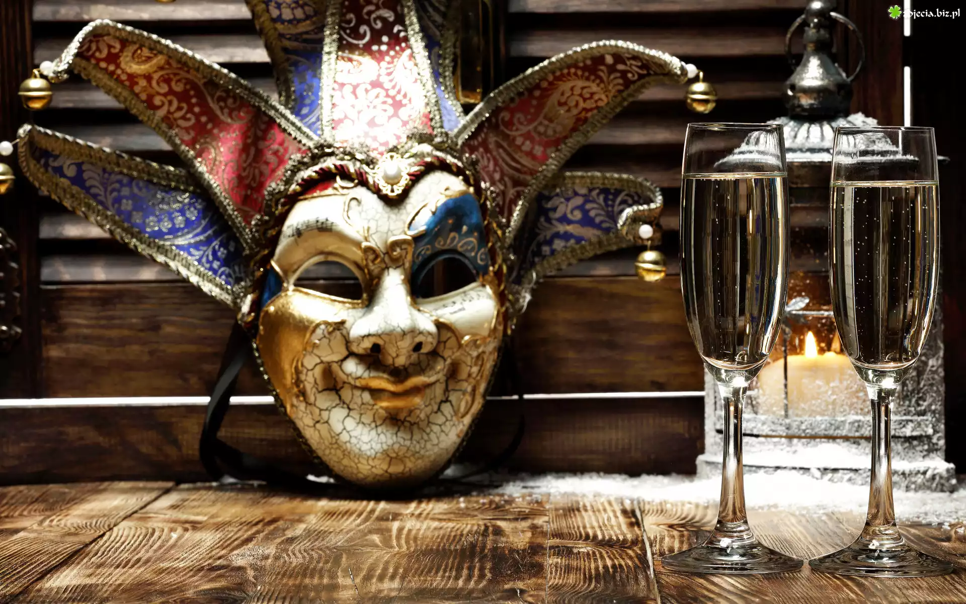 Zdjęcie Kompozycja, Karnawał, Maska, Sylwester, Szampan, Kieliszki, Lampion, Świeca