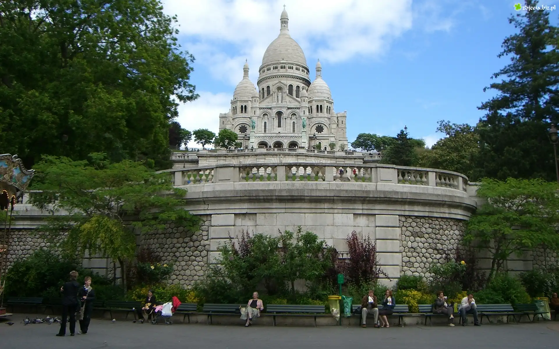 Zdjęcie, Katedra, Drzewa, Ławki, Turyści