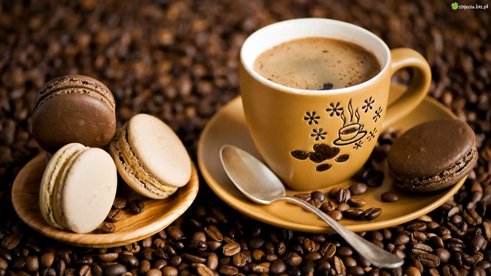 Zdjęcie, Kawa, Ziarna, Filiżanka, Talerzyk, Ciasteczka, Makaroniki