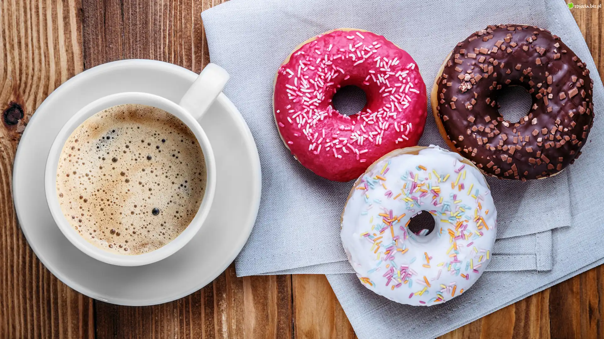 Zdjęcie Filiżanka, Kawa, Trzy, Pączki, Donuty, Serwetki, Deski