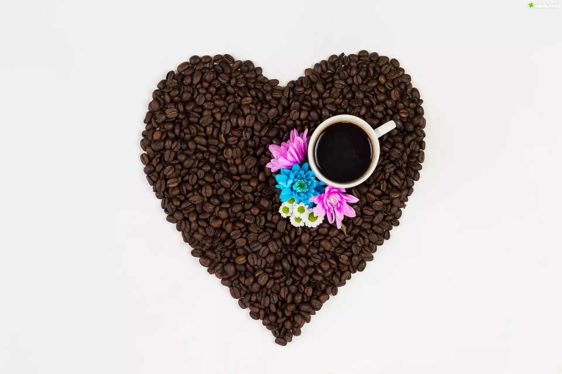 Zdjęcie Kawa, Ziarna, Serce, Kubek, Kwiatki