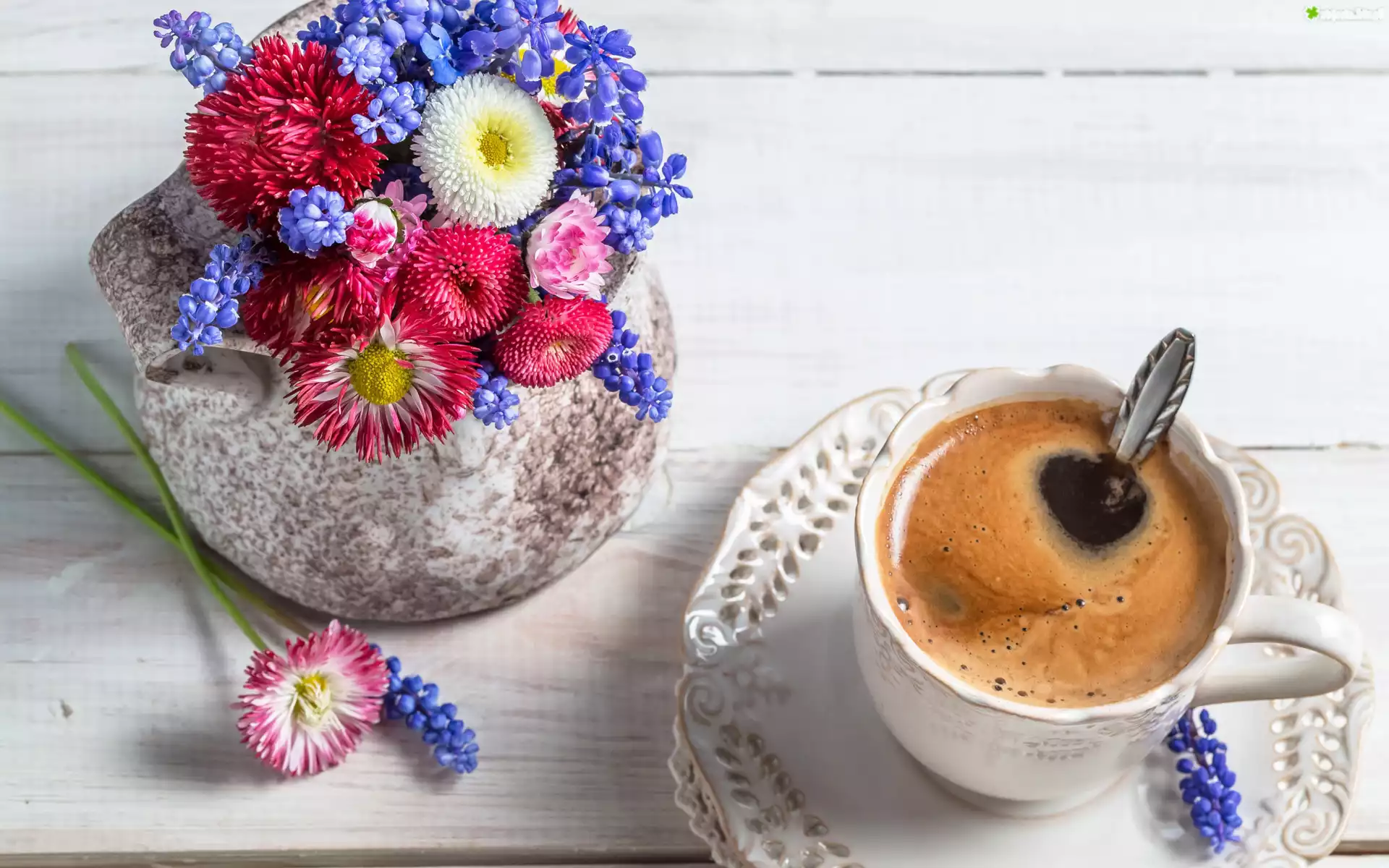 Zdjęcie Kawa, Bukiecik, Kwiaty, Stokrotki