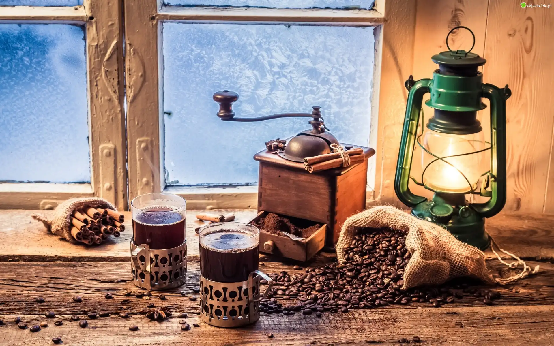 Zdjęcie, Kawa, Szklanki, Ziarna, Lampa, Młynek