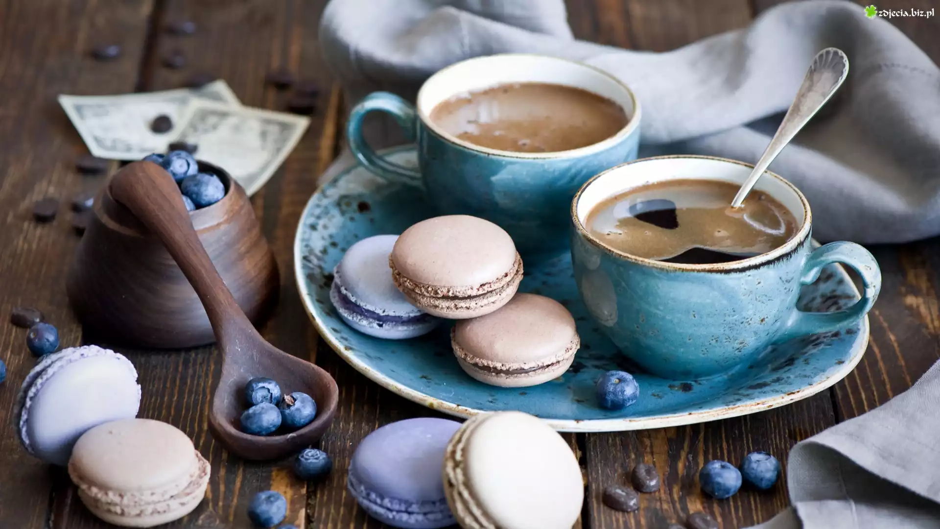 Zdjęcie, Kawa, Filiżanki, Ciasteczka, Makaroniki, Borówki